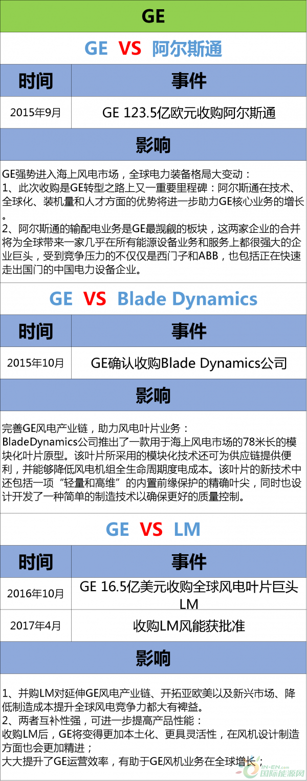 维斯塔斯在布局风电运维后市场时,全球风电巨头GE公司却在收购风电叶片公司,拓展其风机业务,进军海上风电市场。在陆上风电业务仅次于维斯塔斯的GE,通过近两年的收购,重点在于补齐其在海上风电的短板,不断完善其产业链,大有和维斯塔斯争夺霸主的劲头。