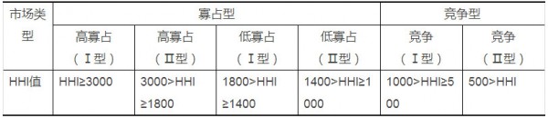 以HHI值为基准的市场结构分类,一般而言,HHI值应界于0与1之间,但通常之表示方法是将其值乘上10000而予以放大,故 HHI应界于0到10000 之间。美国司法部(Department of Justice)利用 HHI作为评估某一产业集中度的指标,并且订出下列的标准:以HHI值为基准的市场结构分类(见表1)。显然,HHI越大,表示市场集中程度越高,垄断程度越高。