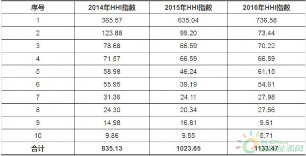 根据近三年的中国风电整机制造企业新增装机容量可见,行业前十名企业的市场份额已达到了80%以上,可初步判断该行业为非完全竞争行业;同时,利用HHI指数的计算原理,可进一步得2014年---2016年风电行业前十企业的HHI指数情况如下所示(见表5)。