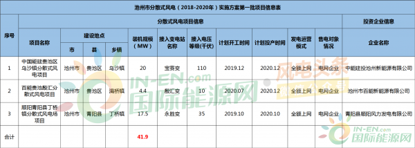 据国际能源网/风电头条(微信号:wind-2005s)统计,池州市分散式风电(2018-2020年)第一批项目共计3个,总