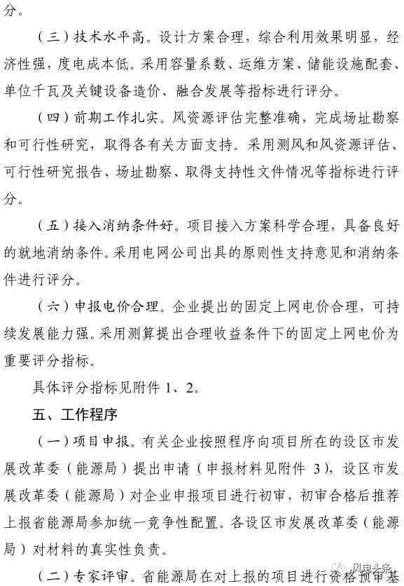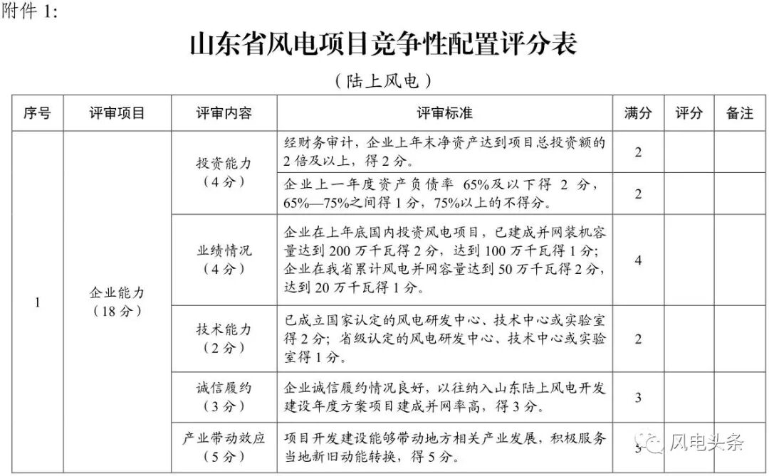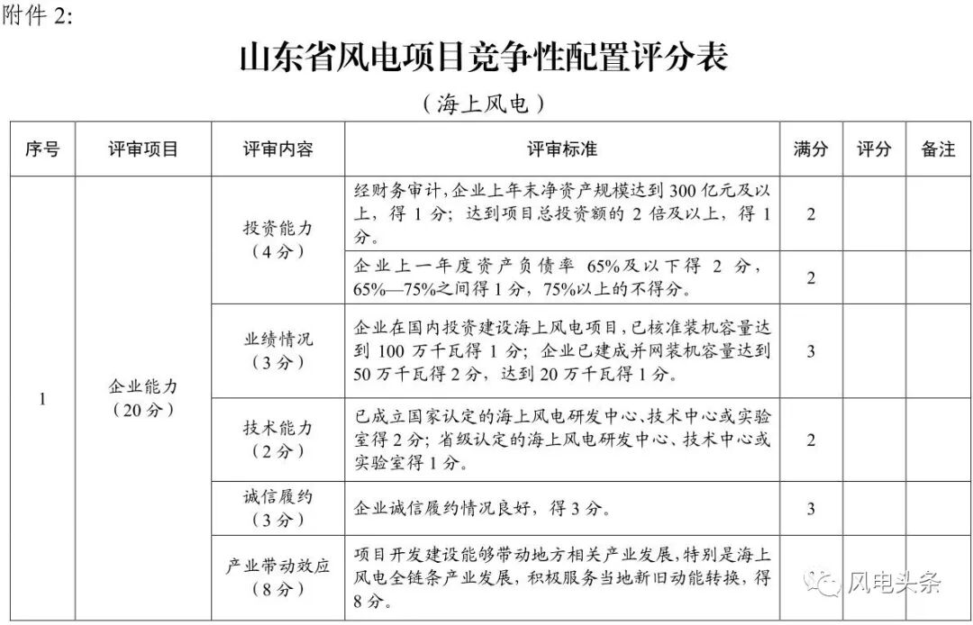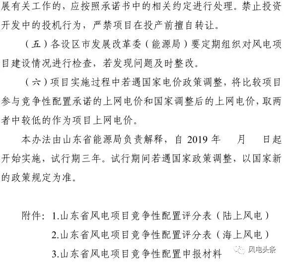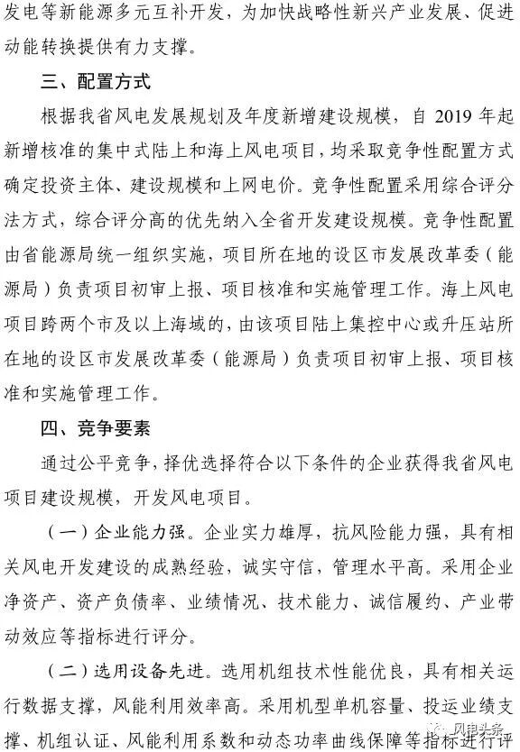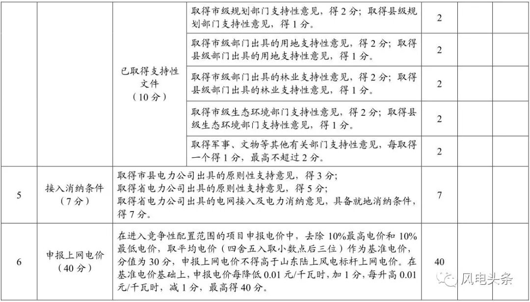 配置方式:根据山东省风电发展规划及年度新增建设规模,自2019年起新增核准的集中式陆上和海上风电项目,均采取竞争性配置方式确定投资主体、建设规模和上网电价。竞争性配置采用综合评分法方式,综合评分高的优先纳入全省开发建设规模。