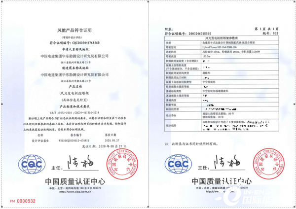 2020年8月,华东院166m免灌浆干式连接分片预制装配式钢-混组合塔架成功取得中国质量认证中心风能产品设计认证。
