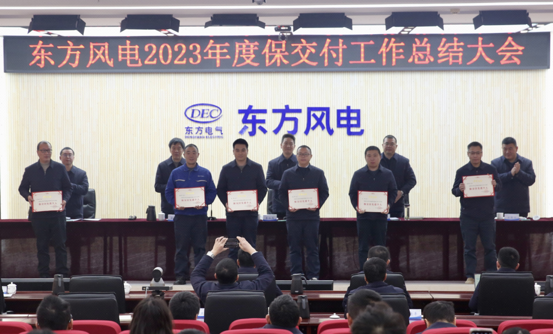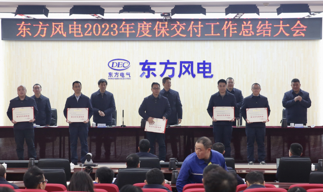 大会对2023年保交付工作先进班组及个人进行了表彰。供应链管理部、东方福建风电、东方天津叶片、东方天津风电围绕保交付进行交流发言。