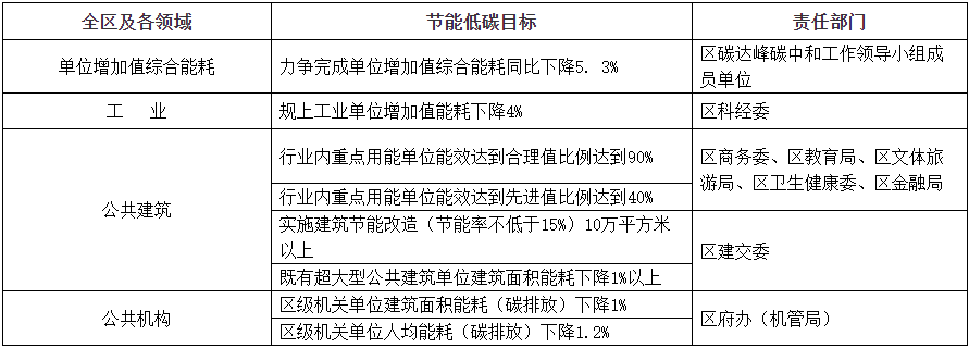 2024年新区碳达峰碳中和及节能降碳计划目标是:力争完成市下达的新区单位增加值能耗(考核口径[1])同比下降5.3%的目标任务,完成市下达的产业结构调整、节能技改、建筑节能、公共机构节能等重点领域工作任务。