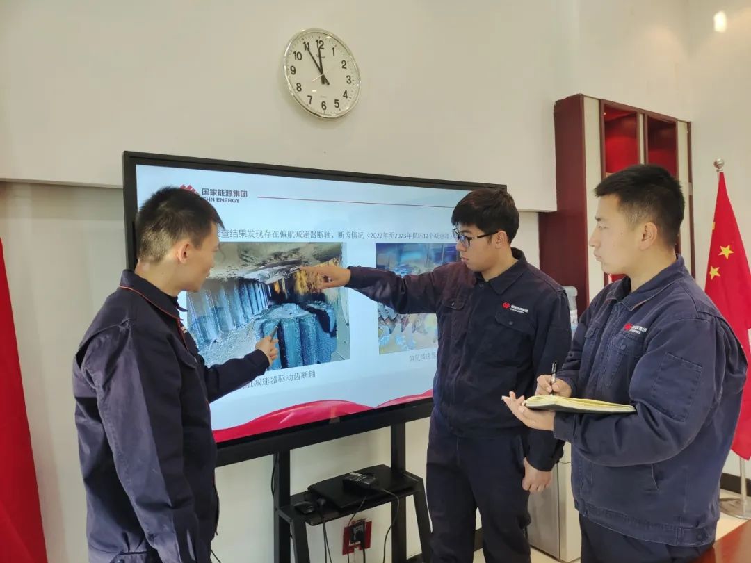 图为职工探讨偏航减速器损坏原因