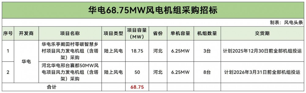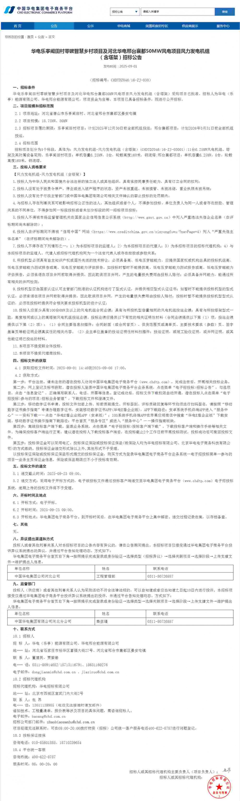 9月1日,华电乐亭阚田村零碳智慧乡村项目及河北华电邢台襄都50MW风电项目风力发电机组(含塔架)招标公告发布。