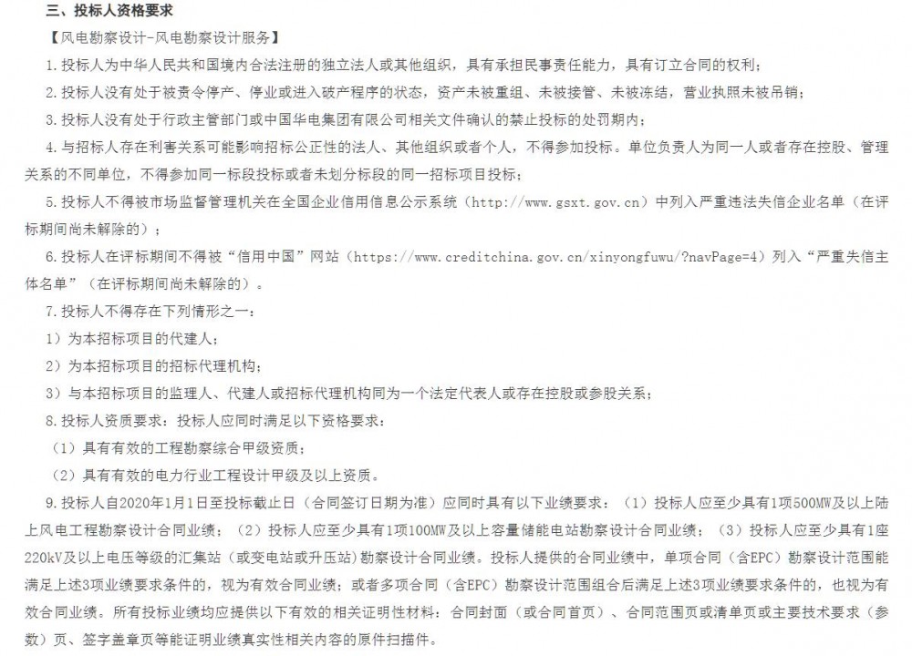 招标范围:风电勘察设计-风电勘察设计服务:本标段采购范围为400万千瓦风电项目的勘察设计工作,包括400万千瓦新建风电项目及配套的储能、220kV升压站勘察设计工作等。本项目勘察设计包括初步设计(优化版)、施工图设计、竣工图编制等阶段及所有与本项目相关的勘察设计工作。