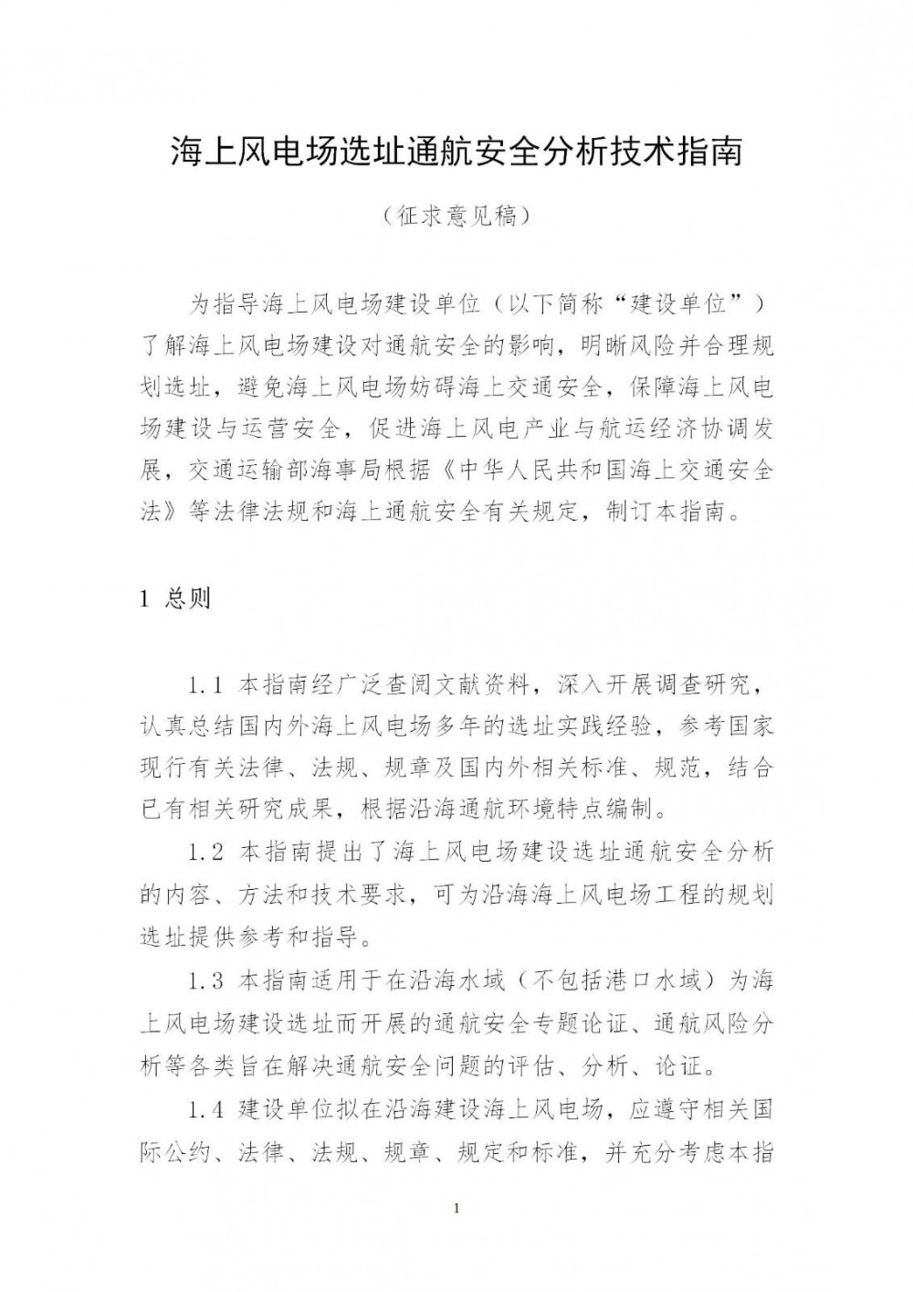 关于征求《海上风电场选址通航安全分析技术指南》等3个指南意见的通知