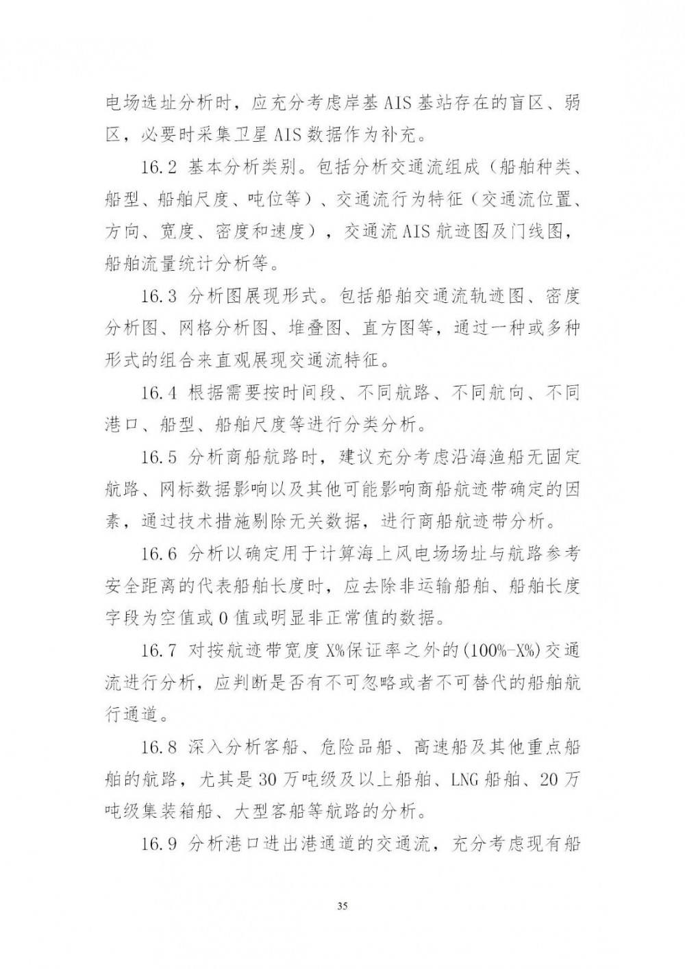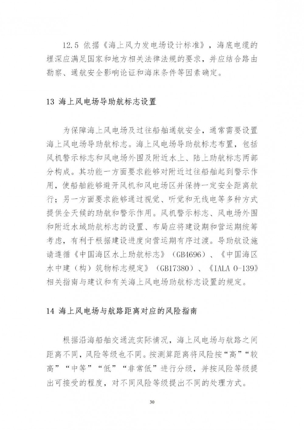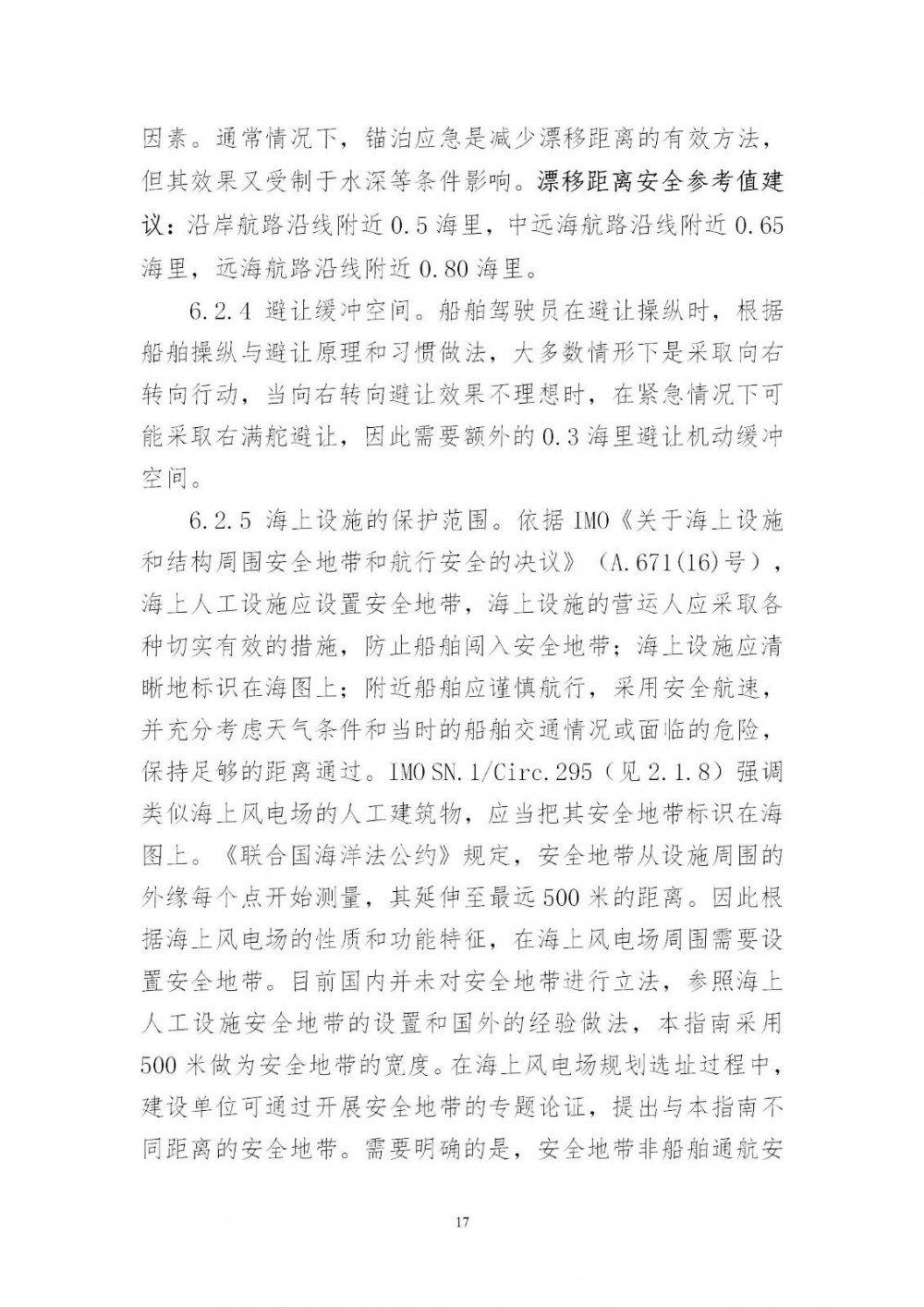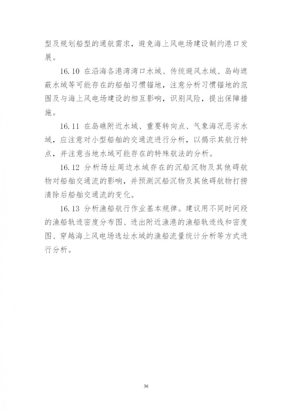 其中,《海上风电场选址通航安全分析技术指南(征求意见稿)》指出,本指南提出了海上风电场建设选址通航安全分析的内容、方法和技术要求,可为沿海海上风电场工程的规划选址提供参考和指导。本指南适用于在沿海水域(不包括港口水域)为海上风电场建设选址而开展的通航安全专题论证、通航风险分析等各类旨在解决通航安全问题的评估、分析、论证。