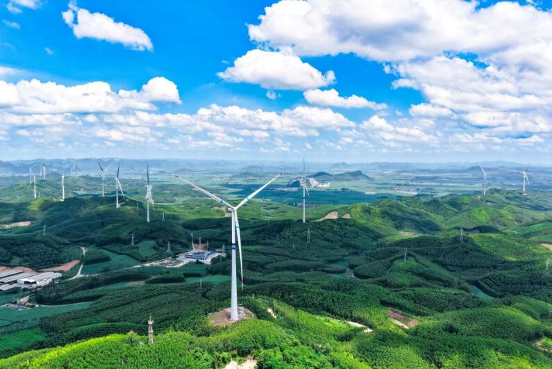 合群风电场二期、东乡风电项目分别以220米叶轮直径刷新广西陆上风电项目叶轮直径纪录,预计今年年底陆续投产;桂中综合智慧储能示范项目作为全国首个集飞轮储能、锂离子、钠离子、全钒液流四种储能于一体的示范项目,有效破解新能源发电“间歇性、波动性”难题,为电力系统安全稳定运行提供重要支撑。