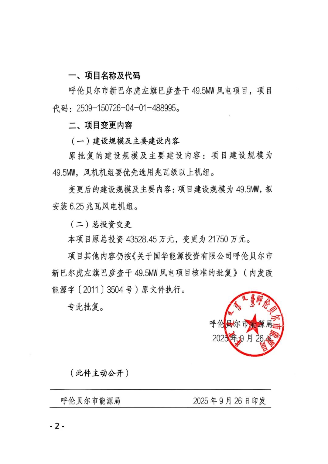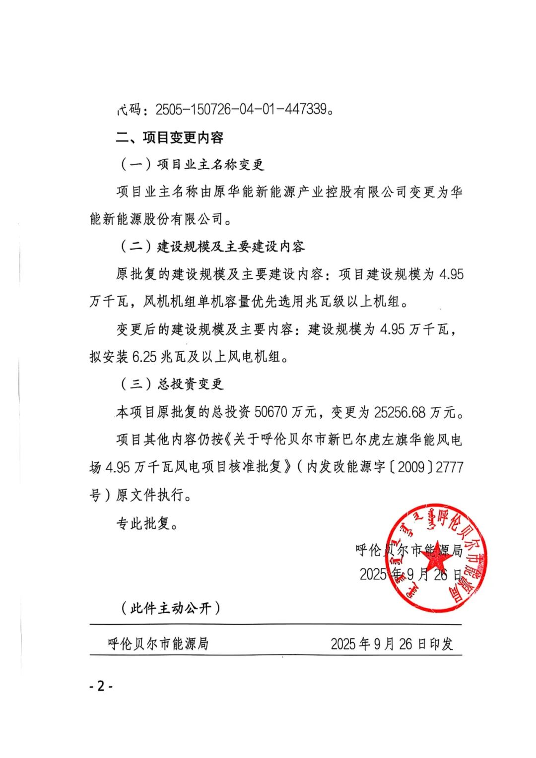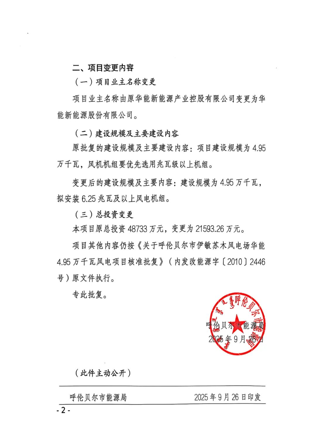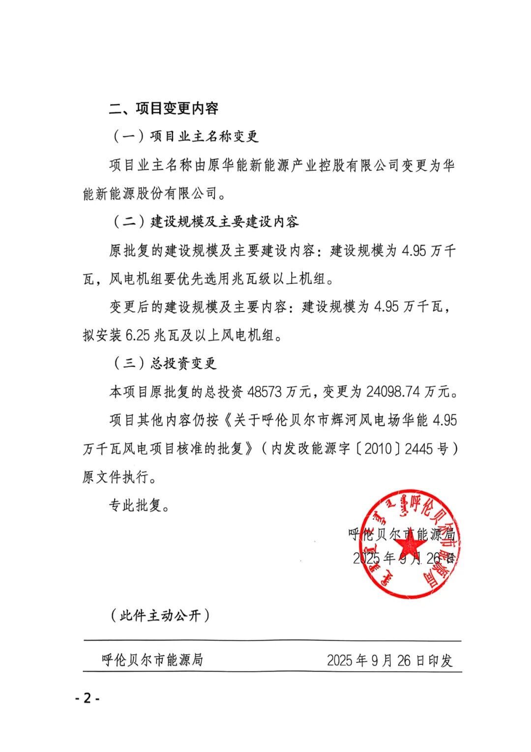 呼伦贝尔市新巴尔虎左旗华能风电场4.95万千瓦风电项目业主名称由原华能新能源产业控股有限公司变更为华能新能源股份有限公司,原批复的建设规模及主要建设内容:项目建设规模为4.95万千瓦,风机机组单机容量优先选用兆瓦级以上机组。变更后的建设规模及主要内容:建设规模为4.95万千瓦拟安装6.25兆瓦及以上风电机组。原批复的总投资50670万元,变更为25256.68万元。