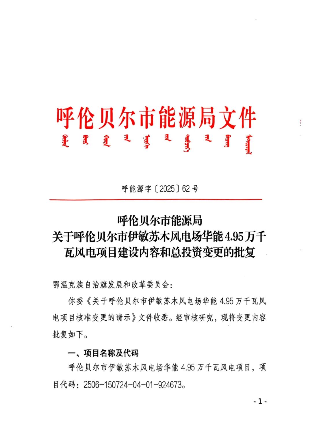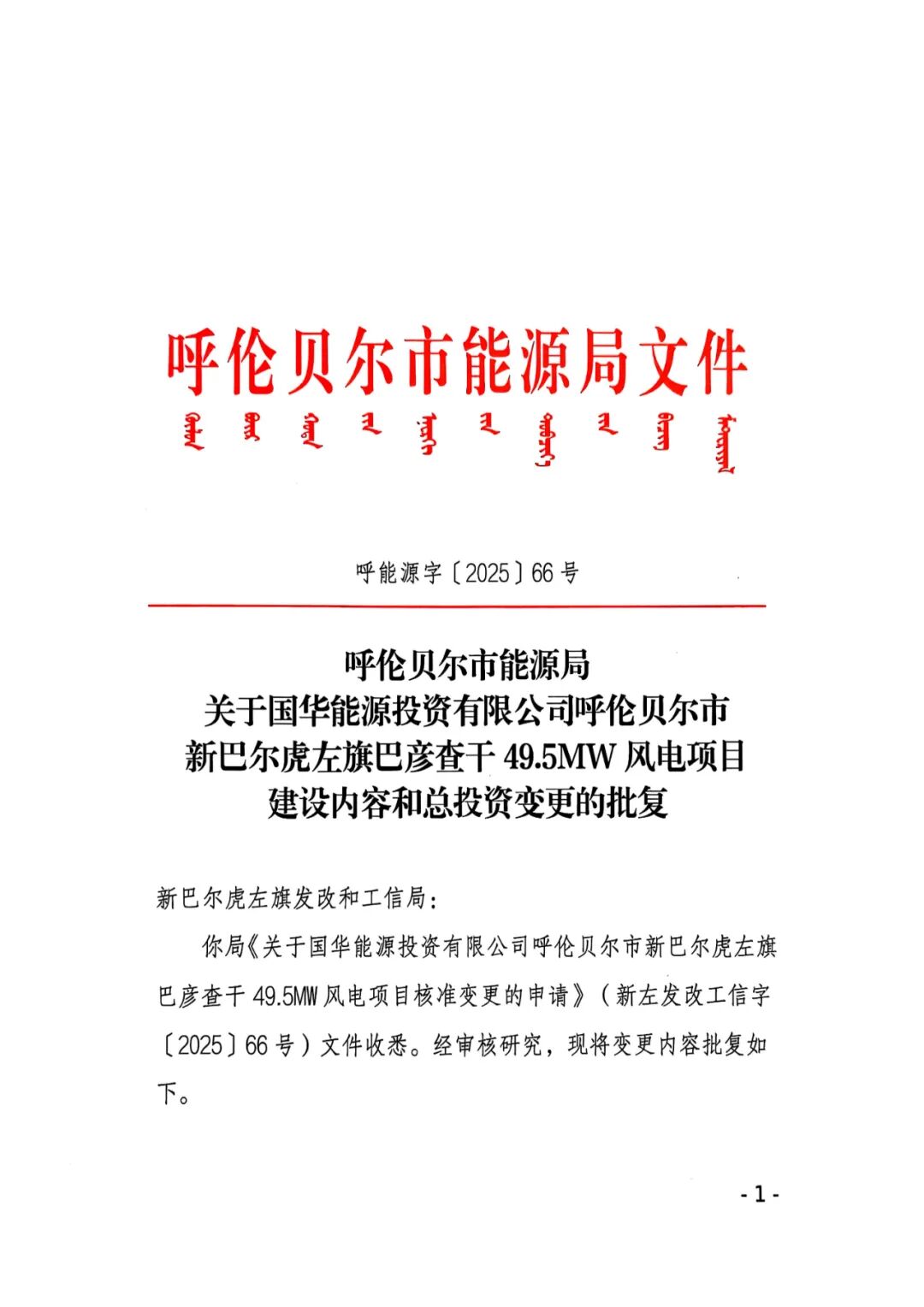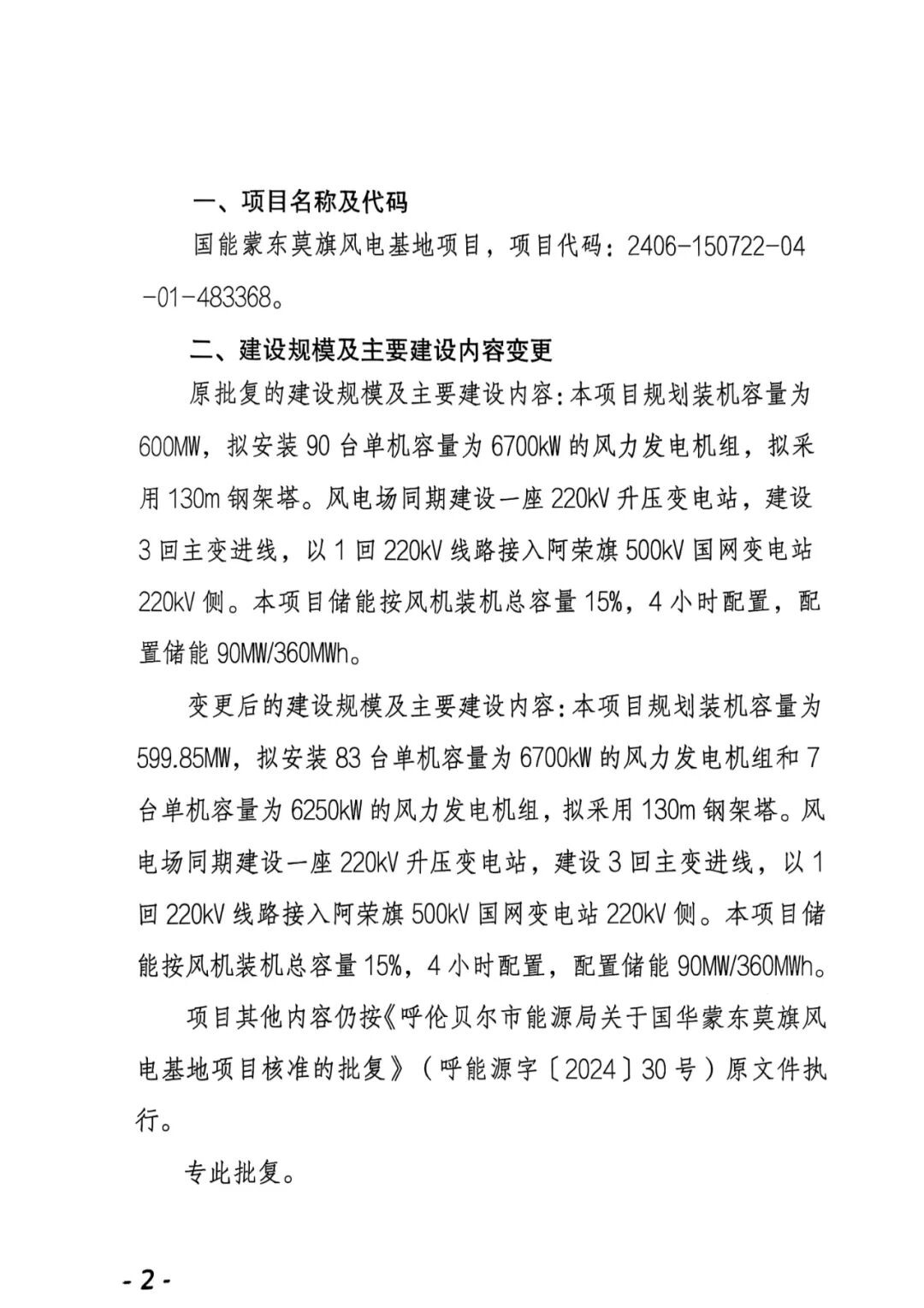 呼伦贝尔市新巴尔虎左旗华能风电场4.95万千瓦风电项目业主名称由原华能新能源产业控股有限公司变更为华能新能源股份有限公司,原批复的建设规模及主要建设内容:项目建设规模为4.95万千瓦,风机机组单机容量优先选用兆瓦级以上机组。变更后的建设规模及主要内容:建设规模为4.95万千瓦拟安装6.25兆瓦及以上风电机组。原批复的总投资50670万元,变更为25256.68万元。
