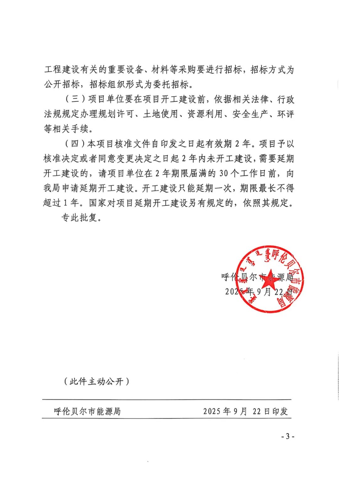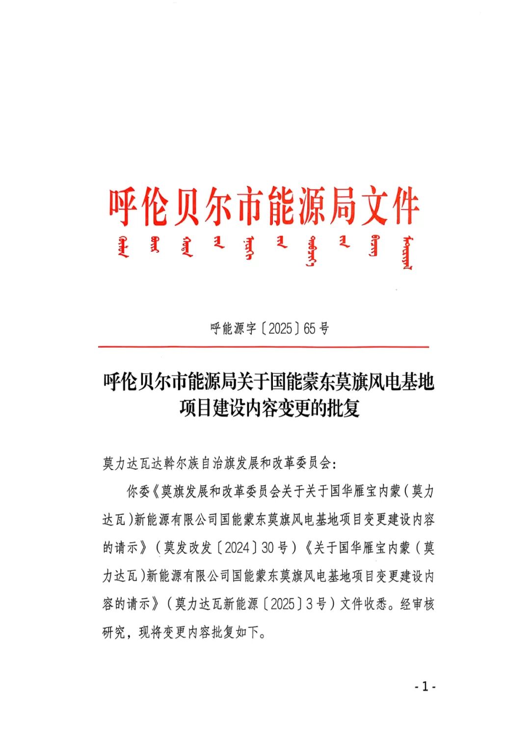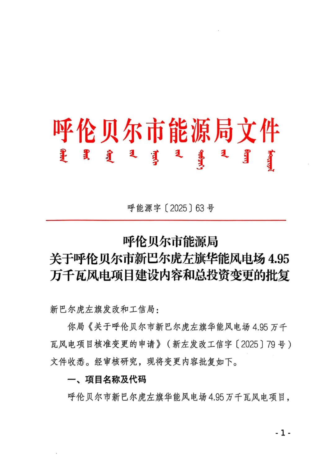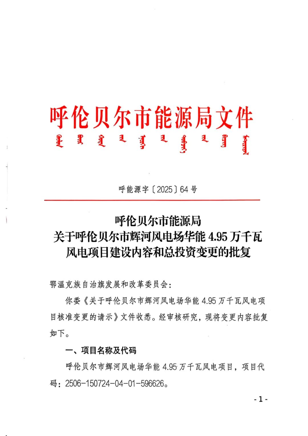 呼伦贝尔市新巴尔虎左旗华能风电场4.95万千瓦风电项目业主名称由原华能新能源产业控股有限公司变更为华能新能源股份有限公司,原批复的建设规模及主要建设内容:项目建设规模为4.95万千瓦,风机机组单机容量优先选用兆瓦级以上机组。变更后的建设规模及主要内容:建设规模为4.95万千瓦拟安装6.25兆瓦及以上风电机组。原批复的总投资50670万元,变更为25256.68万元。