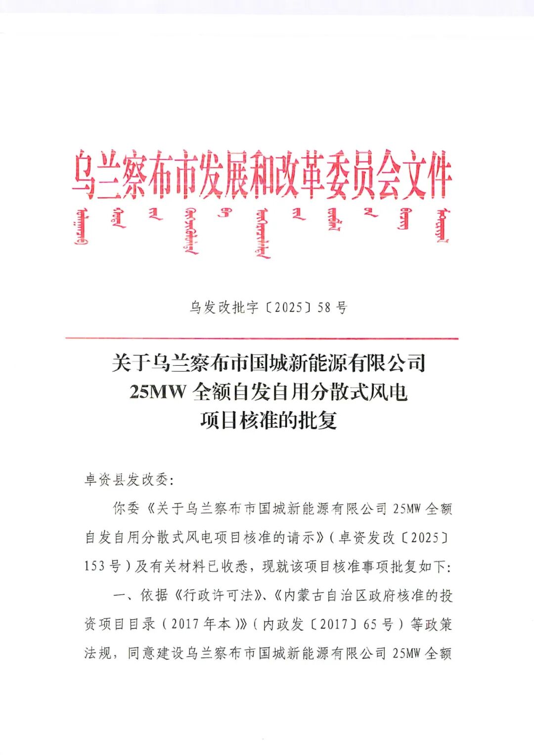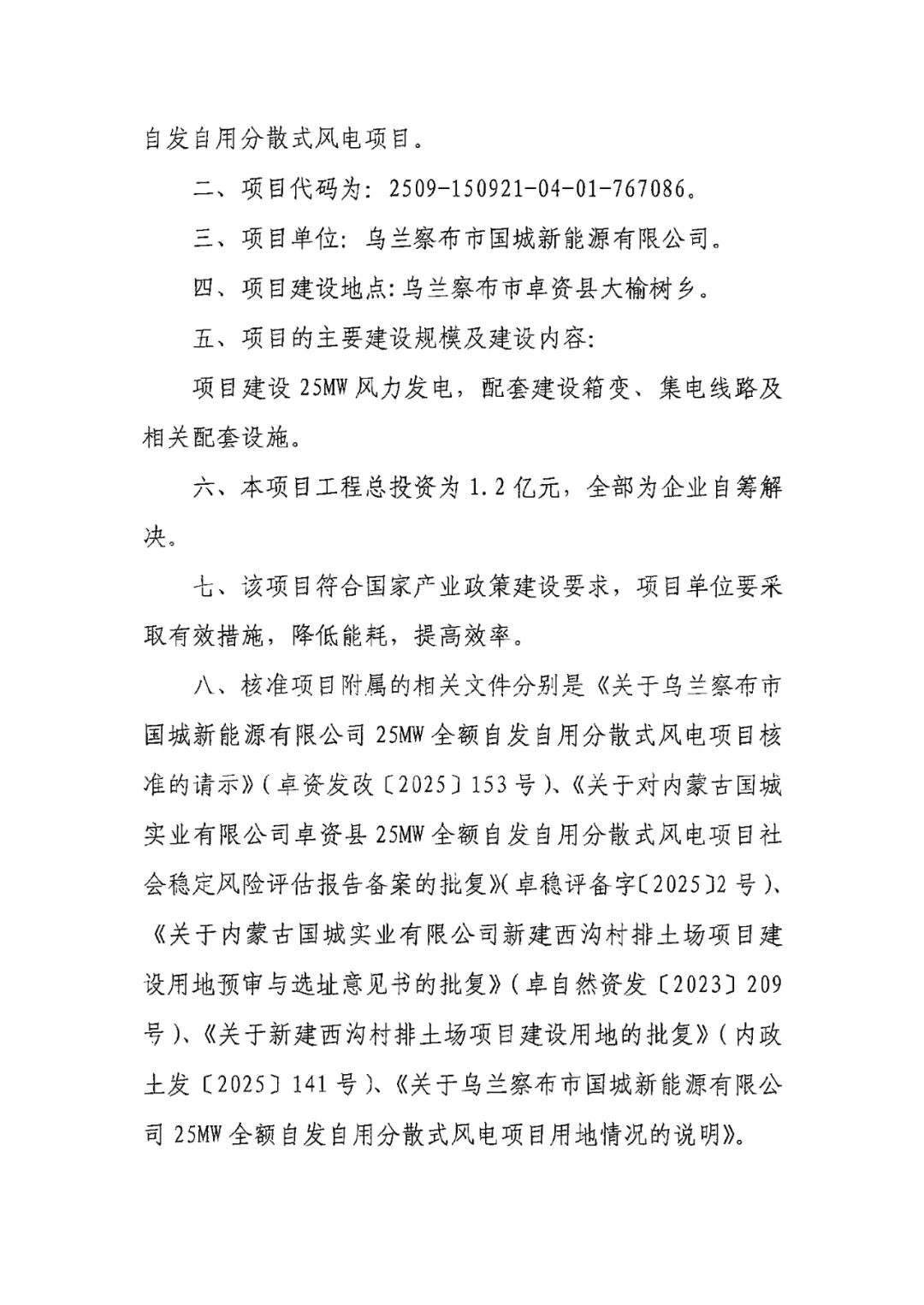 乌兰察布市国城新能源有限公司25MW全额自发自用分散式风电项目位于乌兰察布市卓资县大榆树乡,项目单位为乌兰察布市国城新能源有限公司,项目建设25MW风力发电,配套建设箱变、集电线路及相关配套设施,项目工程总投资为1.2亿元。