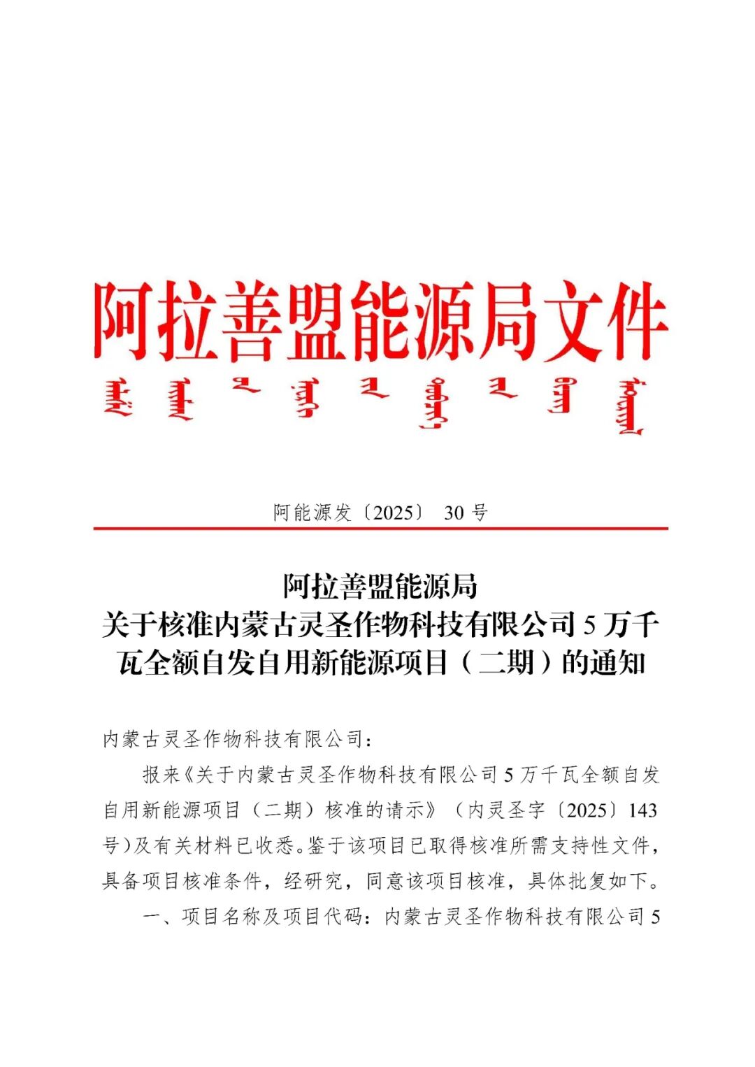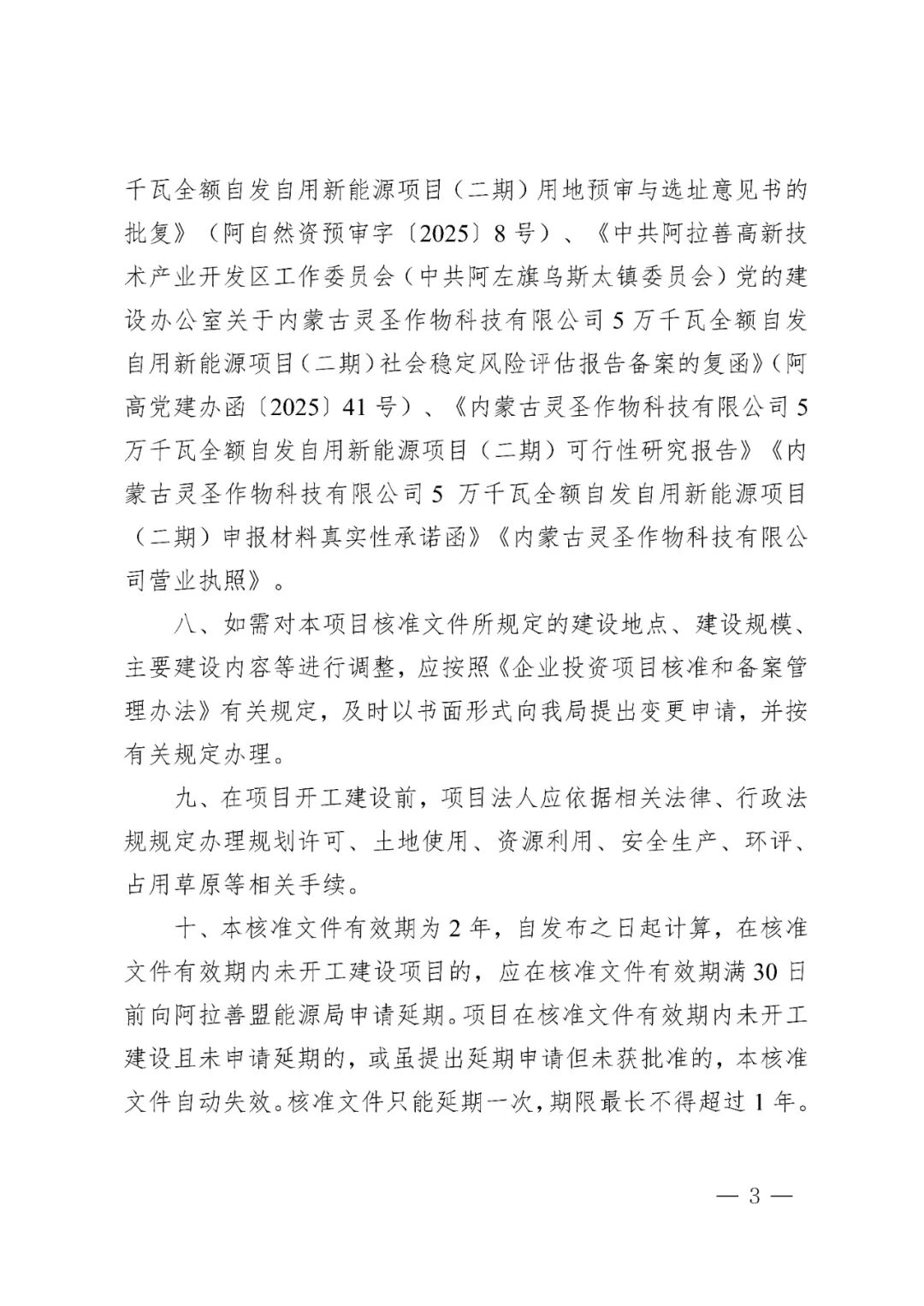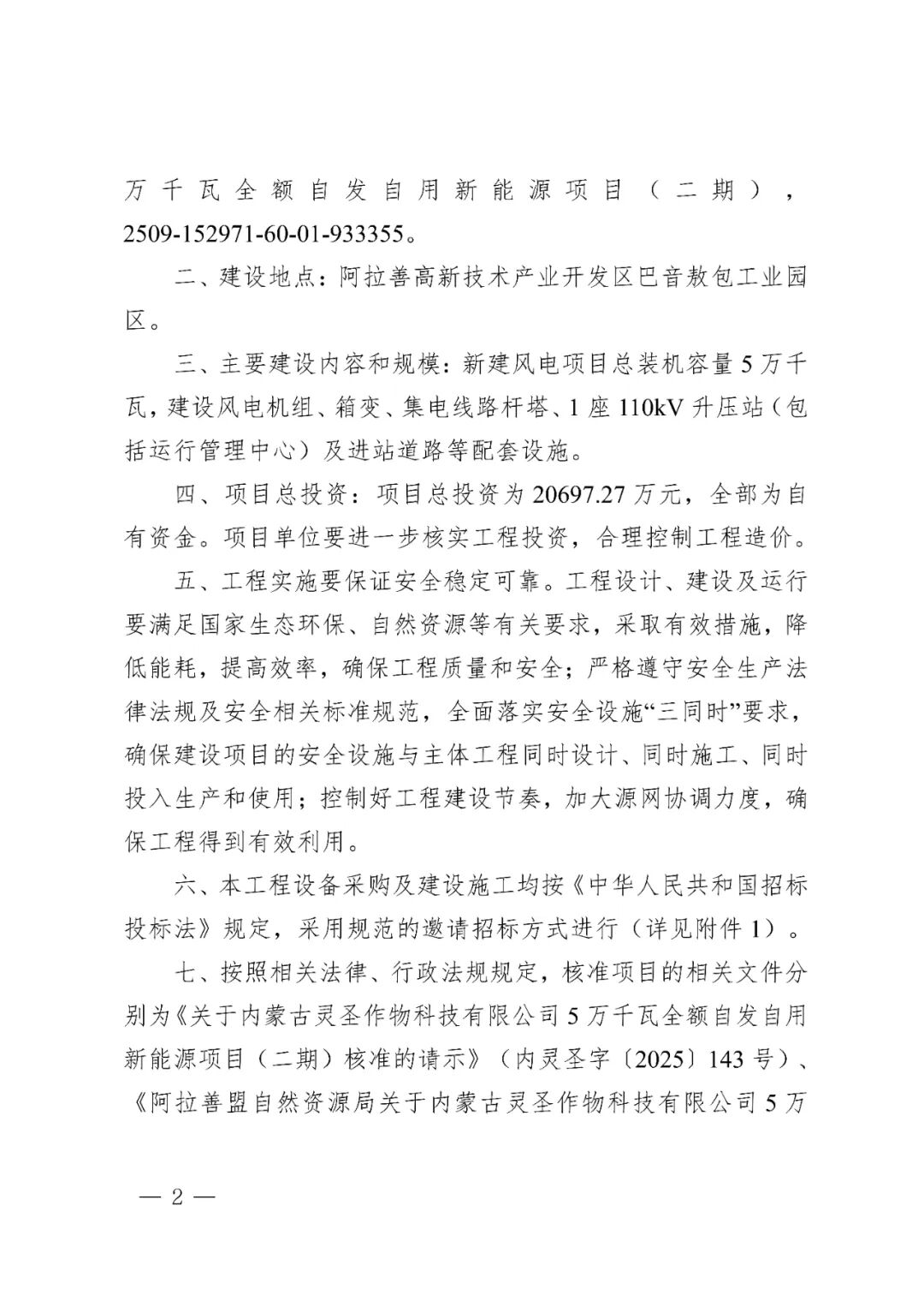 内蒙古灵圣作物科技有限公司5万千瓦全额自发自用新能源项目(二期)建设地点位于阿拉善高新技术产业开发区巴音敖包工业园区,项目新建风电项目总装机容量5万千瓦,建设风电机组、箱变、集电线路杆塔、1座110kV升压站(包括运行管理中心)及进站道路等配套设施,项目总投资为20697.27万元。