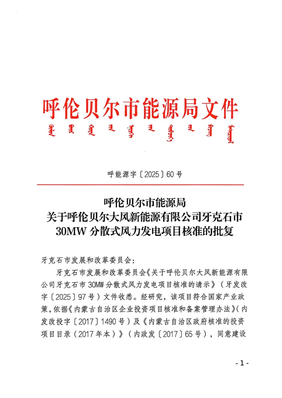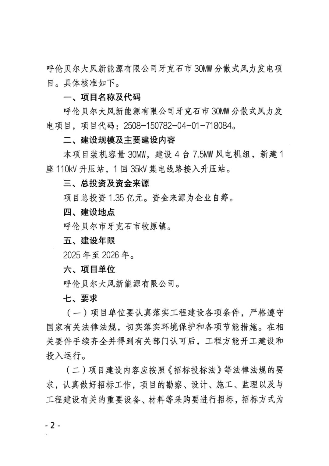 呼伦贝尔大风新能源有限公司牙克石市30MW分散式风力发电项目位于呼伦贝尔市牙克石市牧原镇,项目装机容量30MW,建设4台7.5MW风电机组,新建1座110kV升压站,1回35kV集电线路接入升压站。项目单位为呼伦贝尔大风新能源有限公司,项目总投资1.35亿元,建设年限为2025年至2026年。
