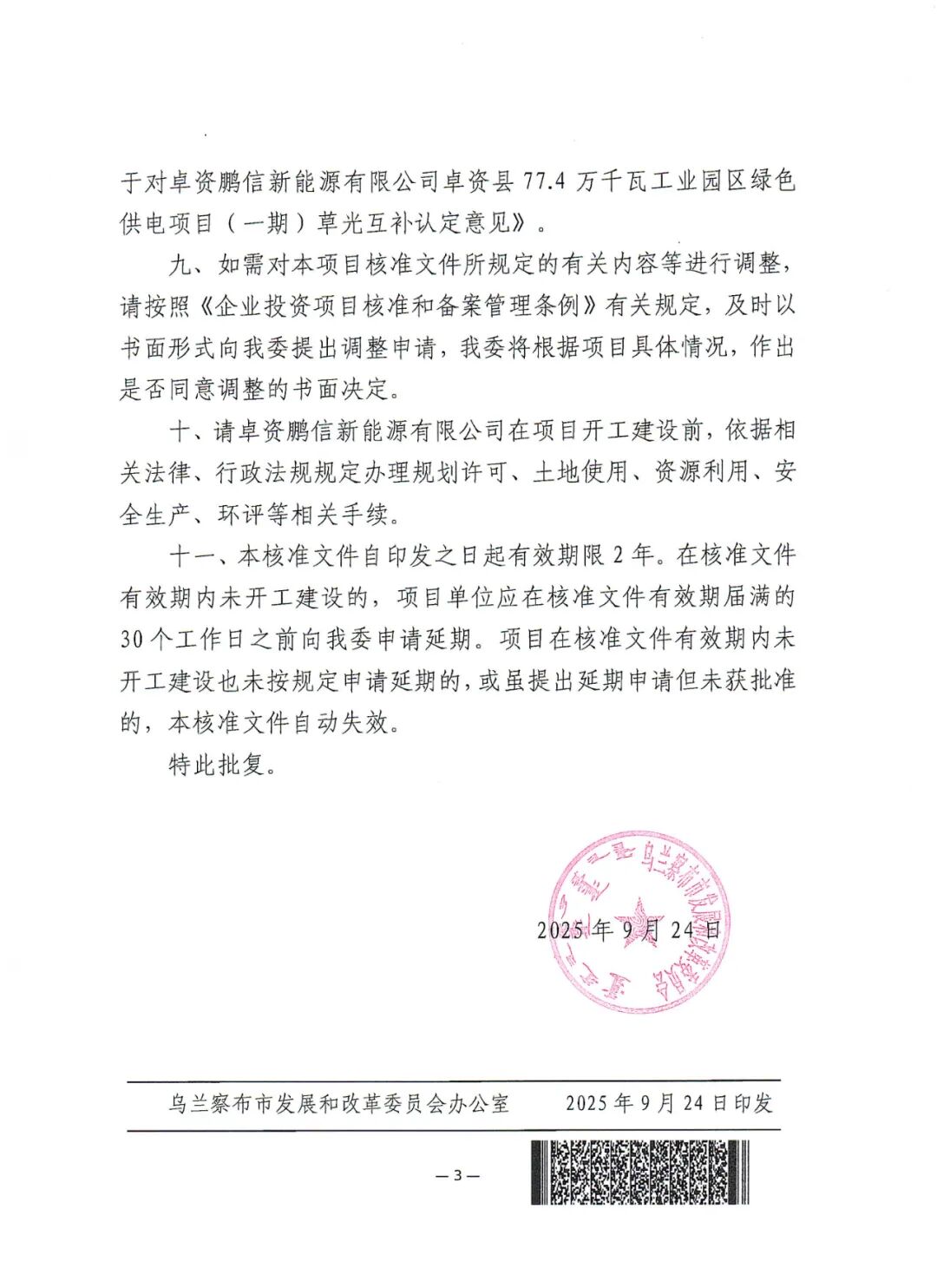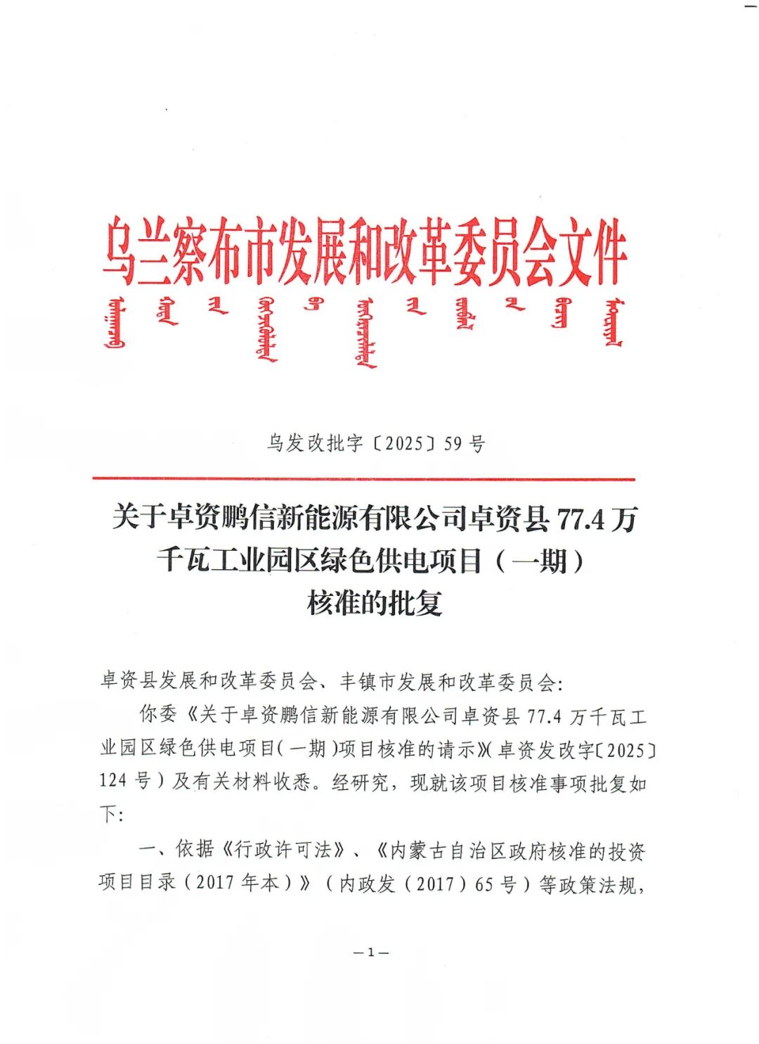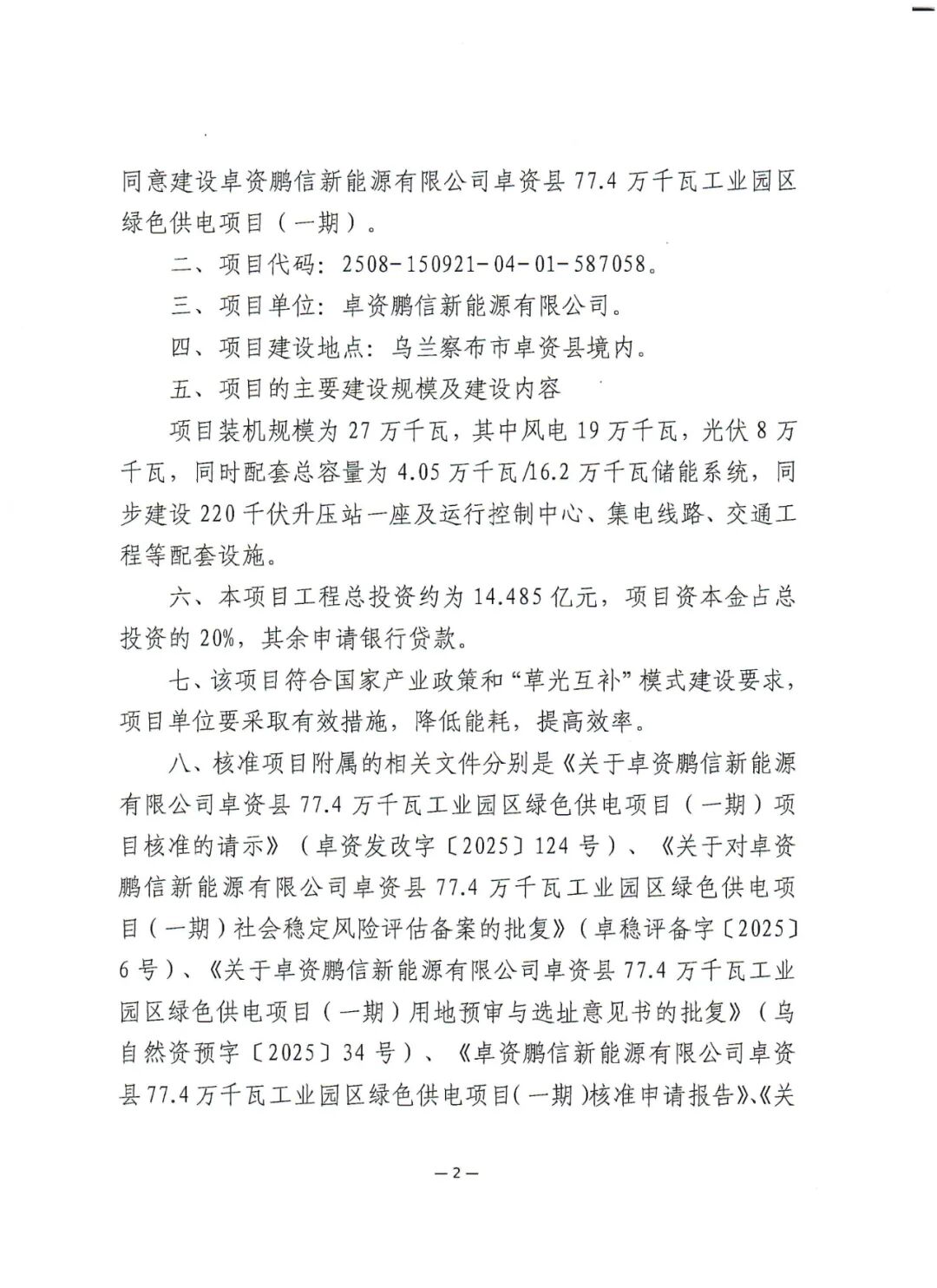 其中,卓资鹏信新能源有限公司卓资县77.4万千瓦工业园区绿色供电项目(一期)位于乌兰察布市卓资县境内,项目单位为卓资鹏信新能源有限公司,项目装机规模为27万千瓦,其中风电19万千瓦,光伏8万千瓦,同时配套总容量为4.05万千瓦16.2万千瓦储能系统,同步建设220千伏升压站一座及运行控制中心、集电线路、交通工程等配套设施。项目工程总投资约为14.485亿元。