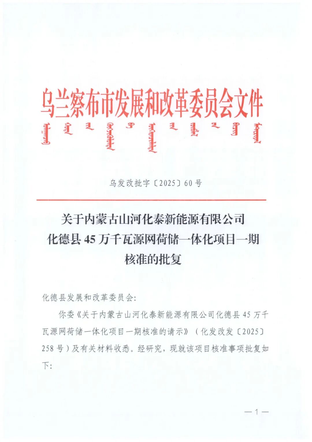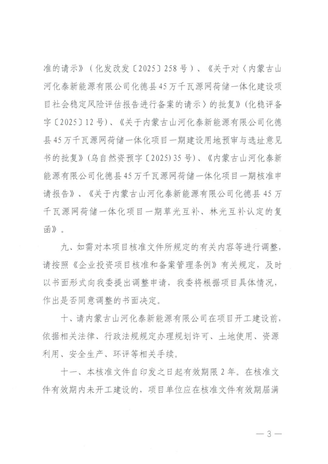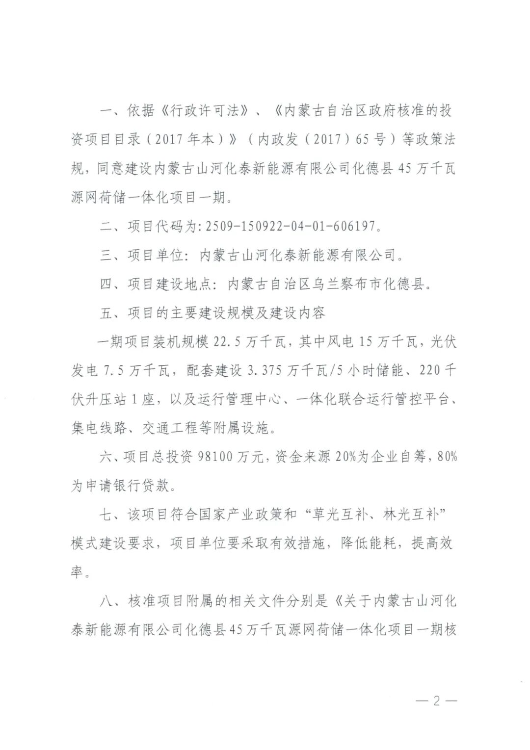 内蒙古山河化泰新能源有限公司化德县45万千瓦源网荷储一体化项目一期建设地点位于内蒙古自治区乌兰察布市化德县,项目单位为内蒙古山河化泰新能源有限公司,一期项目装机规模22.5万千瓦,其中风电15万千瓦,光伏发电7.5万千瓦,配套建设3.375 万千瓦/5小时储能、220千伏升压站1座,以及运行管理中心、一体化联合运行管控平台集电线路、交通工程等附属设施。项目总投资98100万元。