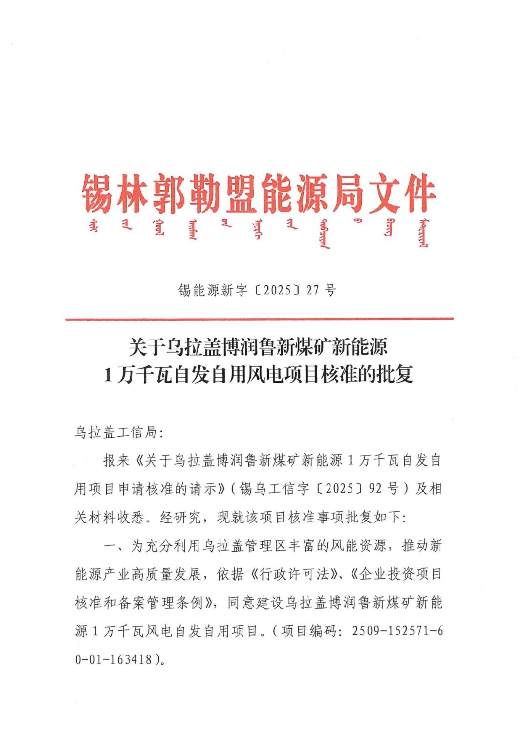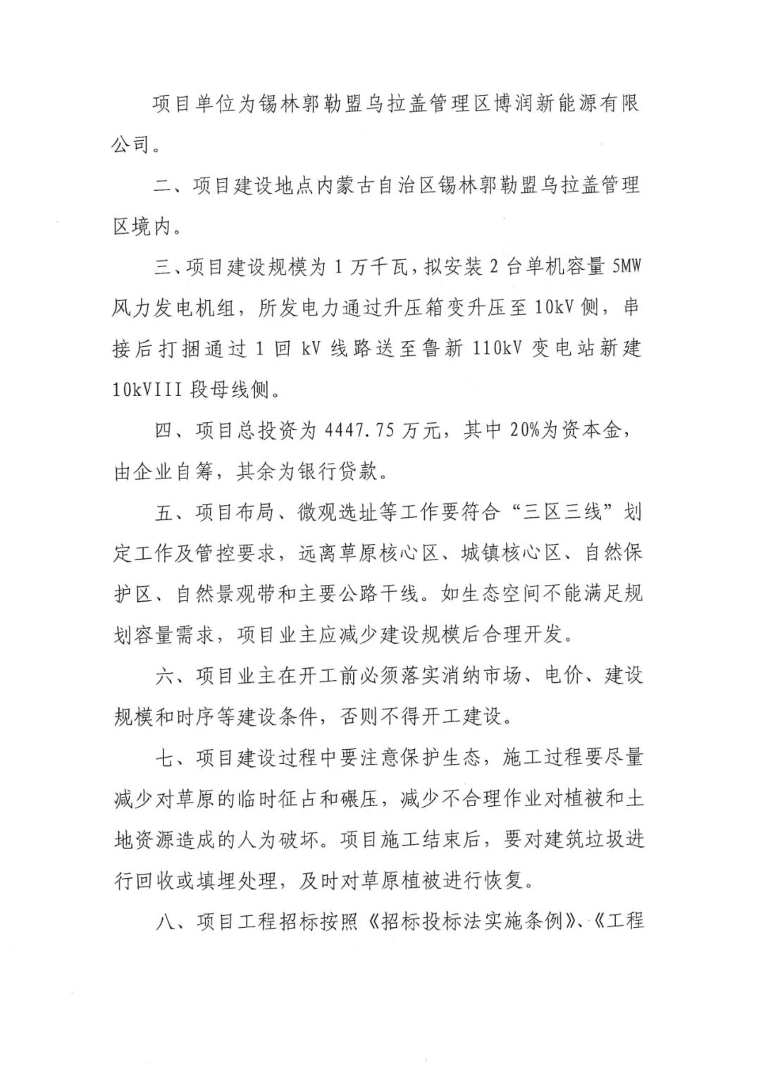 乌拉盖博润鲁新煤矿新能源1万千瓦自发自用风电项目建设地点位于内蒙古自治区锡林郭勒盟乌拉盖管理区境内,项目单位为锡林郭勒盟乌拉盖管理区博润新能源有限公司,项目建设规模为1万千瓦,拟安装2台单机容量5MW风力发电机组,所发电力通过升压箱变升压至10kV侧,串接后打捆通过1回kV线路送至鲁新110kV变电站新建10kVIII段母线侧。项目总投资为4447.75万元。