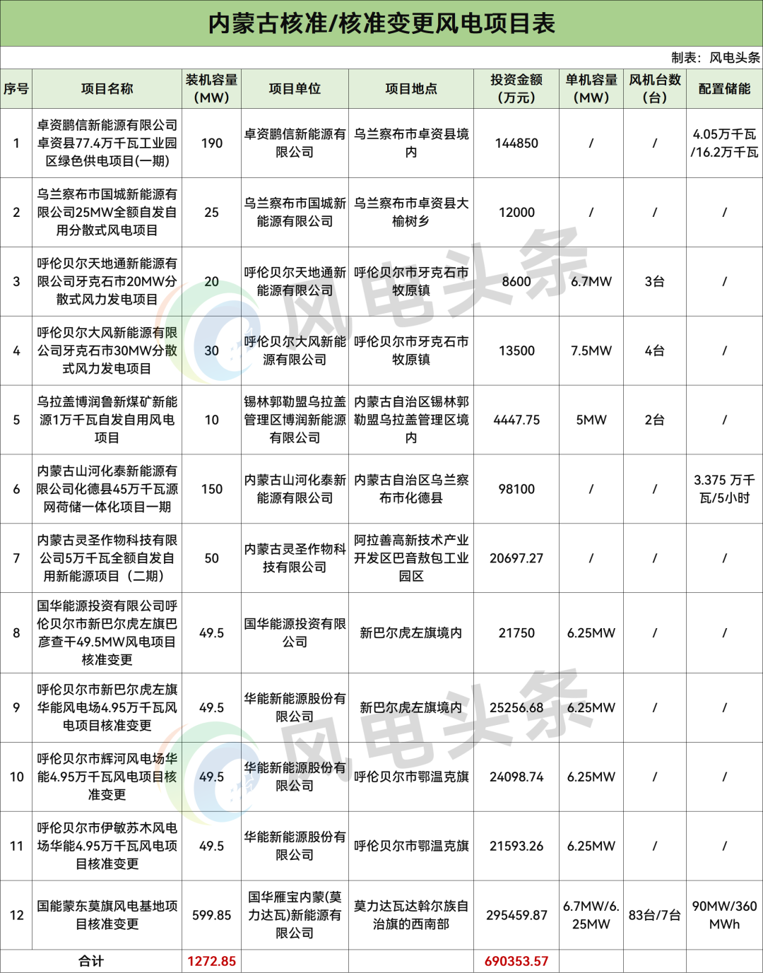 项目业主涉及华能、国家能源集团、内蒙古山河实业集团有限公司、国城控股集团有限公司、亨莱福集团有限公司、内蒙古博润新能源有限公司等。