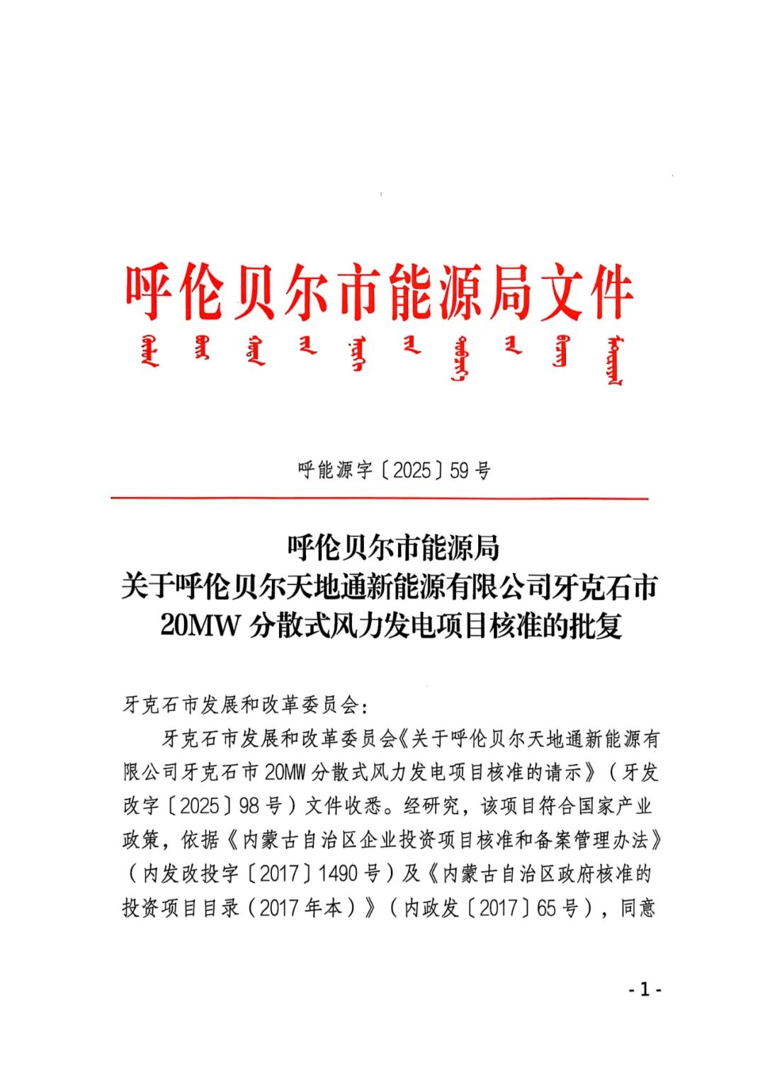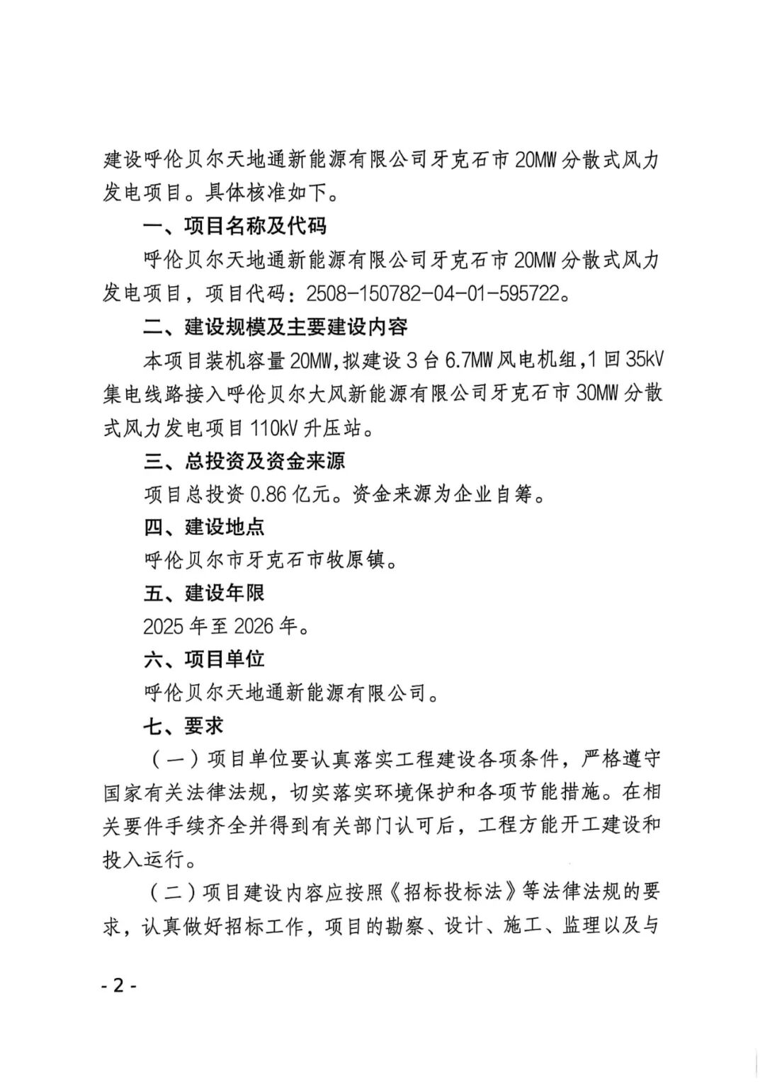呼伦贝尔天地通新能源有限公司牙克石市20MW分散式风力发电项目位于呼伦贝尔市牙克石市牧原镇,项目装机容量20MW,拟建设3台6.7MW风电机组,1回35kV集电线路接入呼伦贝尔大风新能源有限公司牙克石市30MW分散式风力发电项目110kV升压站。项目总投资0.86亿元。