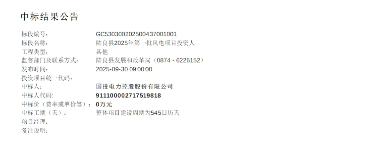 风电头条获悉,9月30日,云南陆良县2025年第一批风电项目投资人中标公告发布。