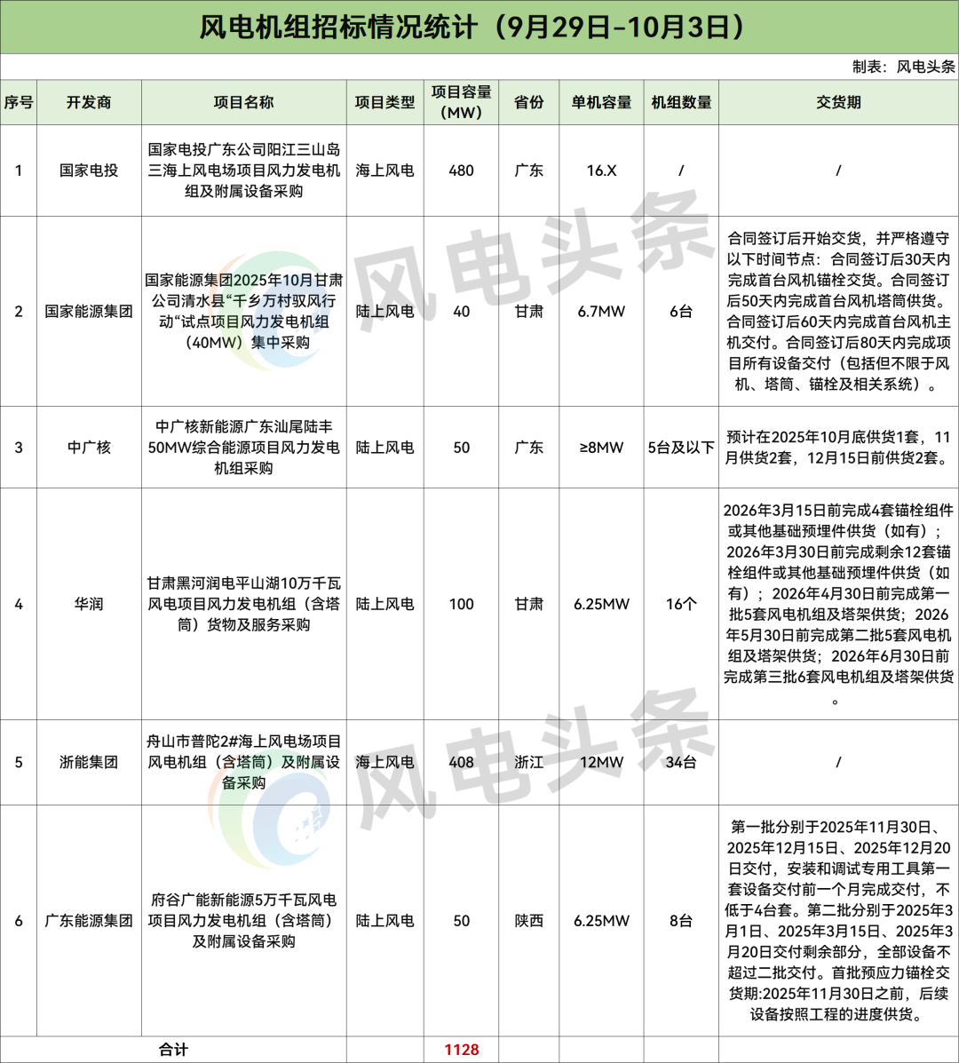 据风电头条统计,本周风机招标市场方面,共6个项目1128MW风机启动采购,开发商是国家电投、国家能源集团、中广核、华润、浙能集团、广东能源集团。