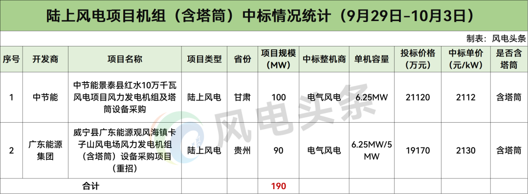 最高中标单价为2130元/kW,项目为威宁县广东能源观风海镇卡子山风电场风力发电机组(含塔筒)设备采购项目(重招);最低中标单价为2112元/kW,项目为中节能景泰县红水10万千瓦风电项目风力发电机组及塔筒设备采购,均由电气风电报出。