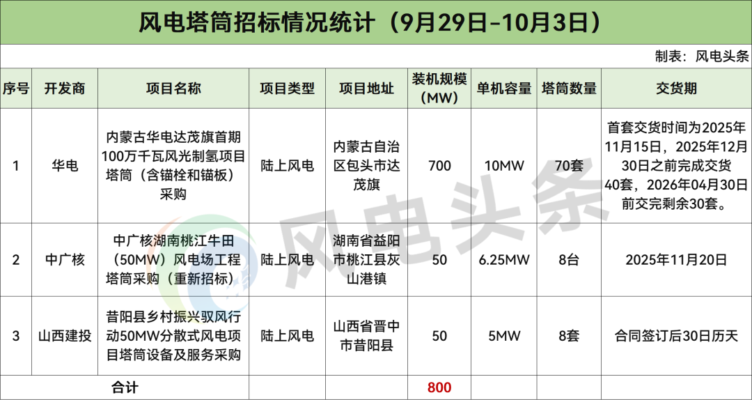 根据招标公告,内蒙古华电达茂旗首期100万千瓦风光制氢项目位于内蒙古自治区包头市达茂旗,建设100万千瓦新能源发电,其中风电700MW,光伏300MW,安装70台单机容量为10MW风力发电机组、405406块740Wp以上半片双玻N型组件,2座220kV升压站及进站道路、集电线路等设备设施配套,建设1座100MW/200MWh磷酸铁锂电池储能电站。建设88台1000Nm/h电解水制氢装置及配套设备,装置年产氢气5.47亿Nm。配置25台2000立方米水容积氢气球罐,储氢能力65万Nm;配套建设1座220kV制氢总降站等设施设备。本次招标采购70套风电机组钢制塔筒(含锚栓和锚板)及其附件。交货期:首套交货时间为2025年11月15日,2025年12月30日之前完成交货40套,2026年04月30日前交完剩余30套。