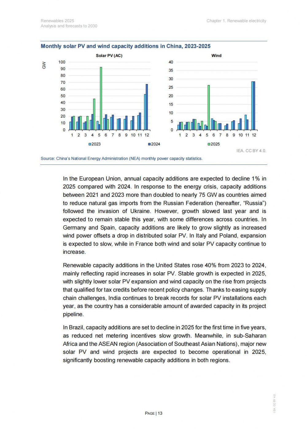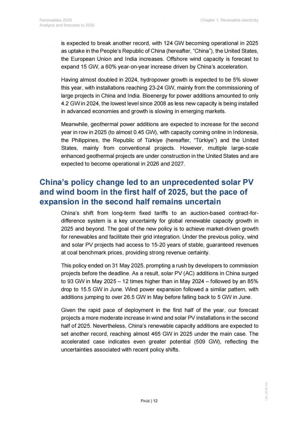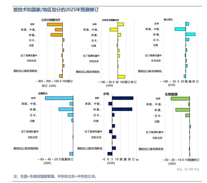 报告对全球可再生能源装机容量增长的预测较去年略有下调,主要原因是美国和中国的政策变化。美国联邦税收优惠政策的提前取消以及其他监管变化,导致 IEA 对美国市场可再生能源的增长预期较去年的预测降低了近 50%。中国从固定电价转向拍卖电价的转变正在影响项目经济效益,导致报告下调了对中国市场可再生能源增长的预测。