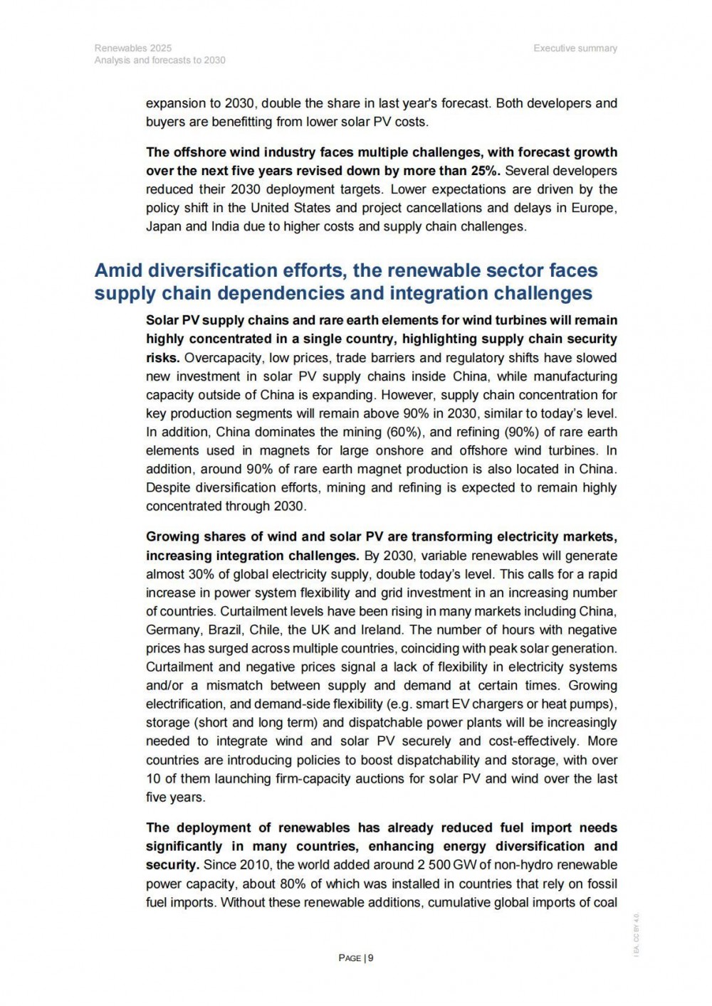 对于海上风电等未来发展,报告预计并不乐观。海上风电行业面临多重挑战,未来五年预测增长率被下调超过 25%。多家开发商降低了 2030 年的部署目标。预期降低的原因是美国政策转变,以及欧洲、日本和印度因成本上升和供应链挑战导致的项目取消和延期。