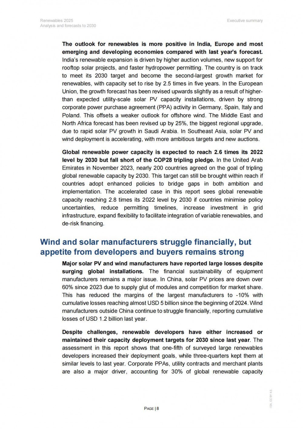 从公司层面来看,对可再生能源的信心依然强劲。大多数大型开发商都维持或提高了 2030 年的部署目标,与去年相比,这反映出该行业的韧性和乐观情绪。然而,海上风电的情况有所不同,由于主要市场的政策变化、供应链瓶颈以及成本上升,其增长前景较弱 —— 比去年的报告低了约四分之一。