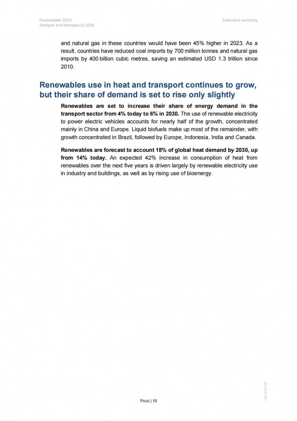 从现在到 2030 年,太阳能光伏预计将主导可再生能源的增长,并将继续成为大多数国家成本最低的新型发电方式。而风电尽管短期面临挑战,但随着供应瓶颈的缓解和项目的推进,尤其是在中国、欧洲和印度,仍将实现大幅扩张。水电和其他可再生能源技术将继续在支持电力系统和提高灵活性方面发挥重要作用。