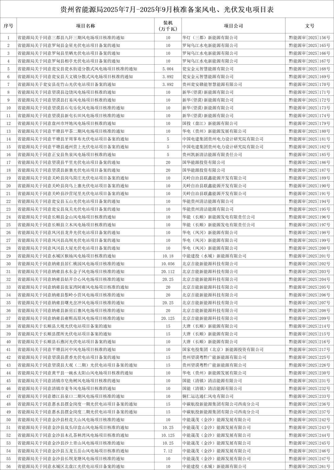 内容显示,贵州省能源局2025年7月-2025年9月核准备案风电、光伏发电项目56个,规模共计646.506万千瓦,其中,风电项目32个,规模合计372.614万千瓦,光伏项目24个,规模合计273.892万千瓦。