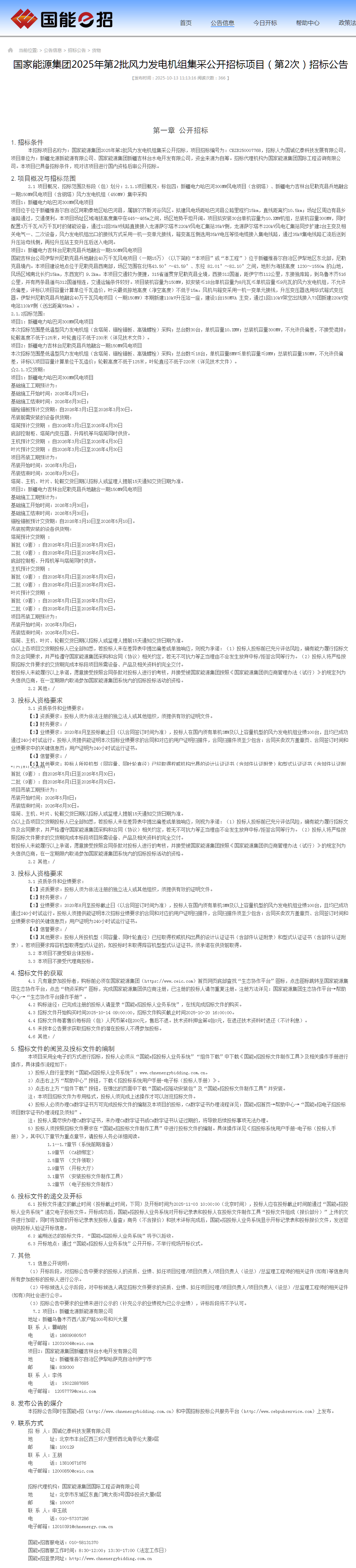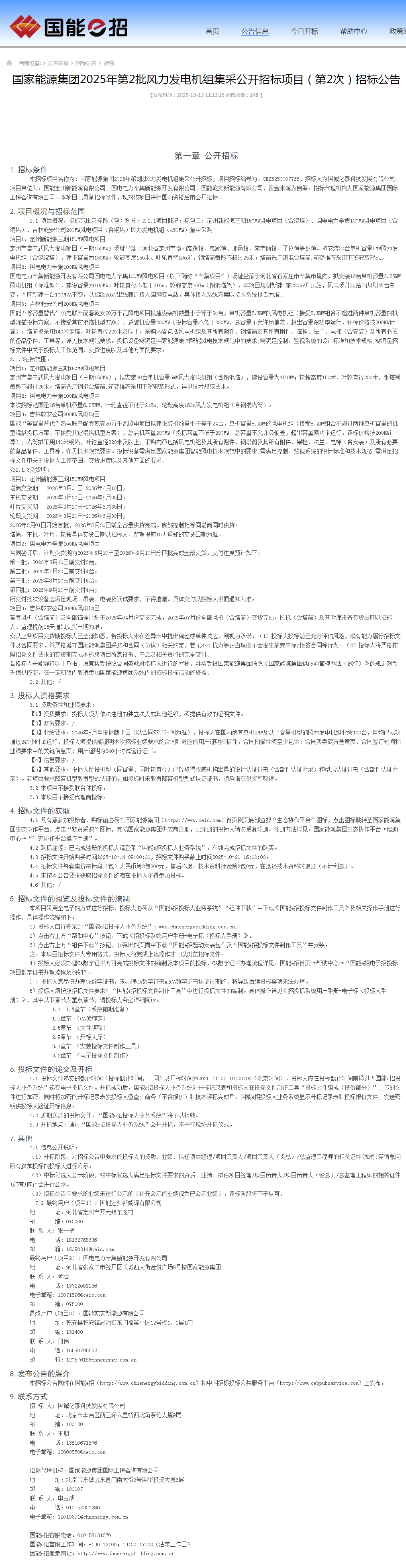 风电头条获悉,10月13日,国家能源集团2025年第2批风力发电机组集采公开招标项目(第2次)招标公告发布。