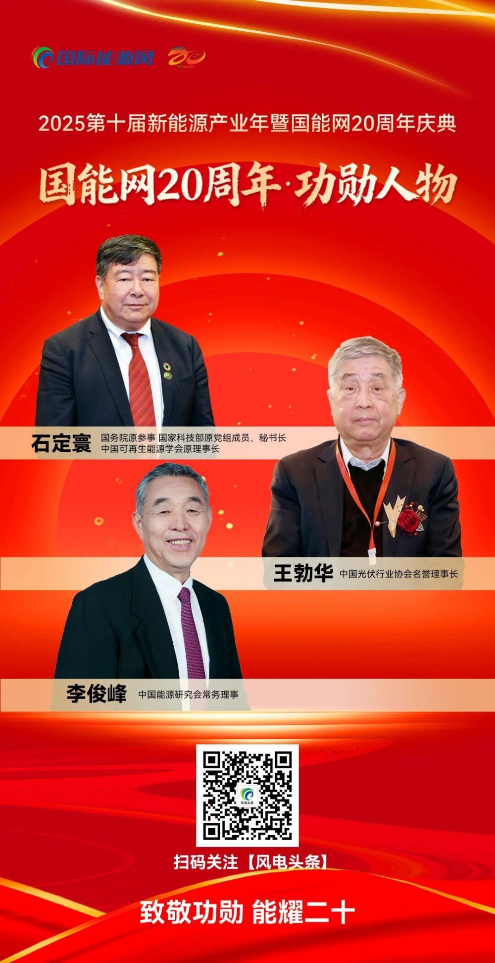 欣悉,在10月10日上午的举办的“2025第十届新能源产业年会暨国能网·20周年庆典”开幕式上,“国能网20周年·功勋人物”重磅揭晓,获此荣誉者分别为国务院原参事,国家科技部原党组成员、秘书长,中国可再生能源学会原理事长石定寰先生;中国光伏行业协会开创者、名誉理事长王勃华先生;中国能源发展见证者,中国能源研究会常务理事李俊峰先生。