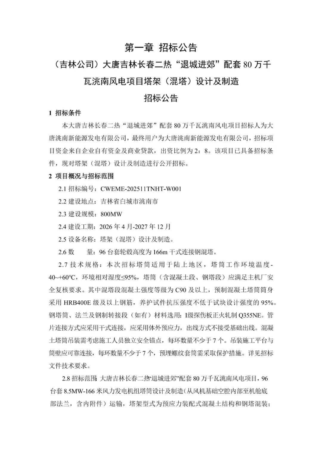 根据招标公告,大唐吉林长春二热退城进郊配套80万千瓦洮南风电项目位于吉林省白城市洮南市,建设规模800MW,建设工期:2026年4月-2027年12月。招标范围:96台套8.5MW-166米风力发电机组塔筒设计及制造(从风机基础空腔内部至机舱底部法兰,含内附件)运输,塔架型式为预应力装配式混凝土结构和钢塔混装;96套塔筒预应力在线监测系统的采购和安装(监测系统终端在南、北升压站内各配置一套)等。交货期:2026年7月1日前交付首批塔筒,后续确保满足项目现场需求均匀交货,2027年8月1日前全部交付。