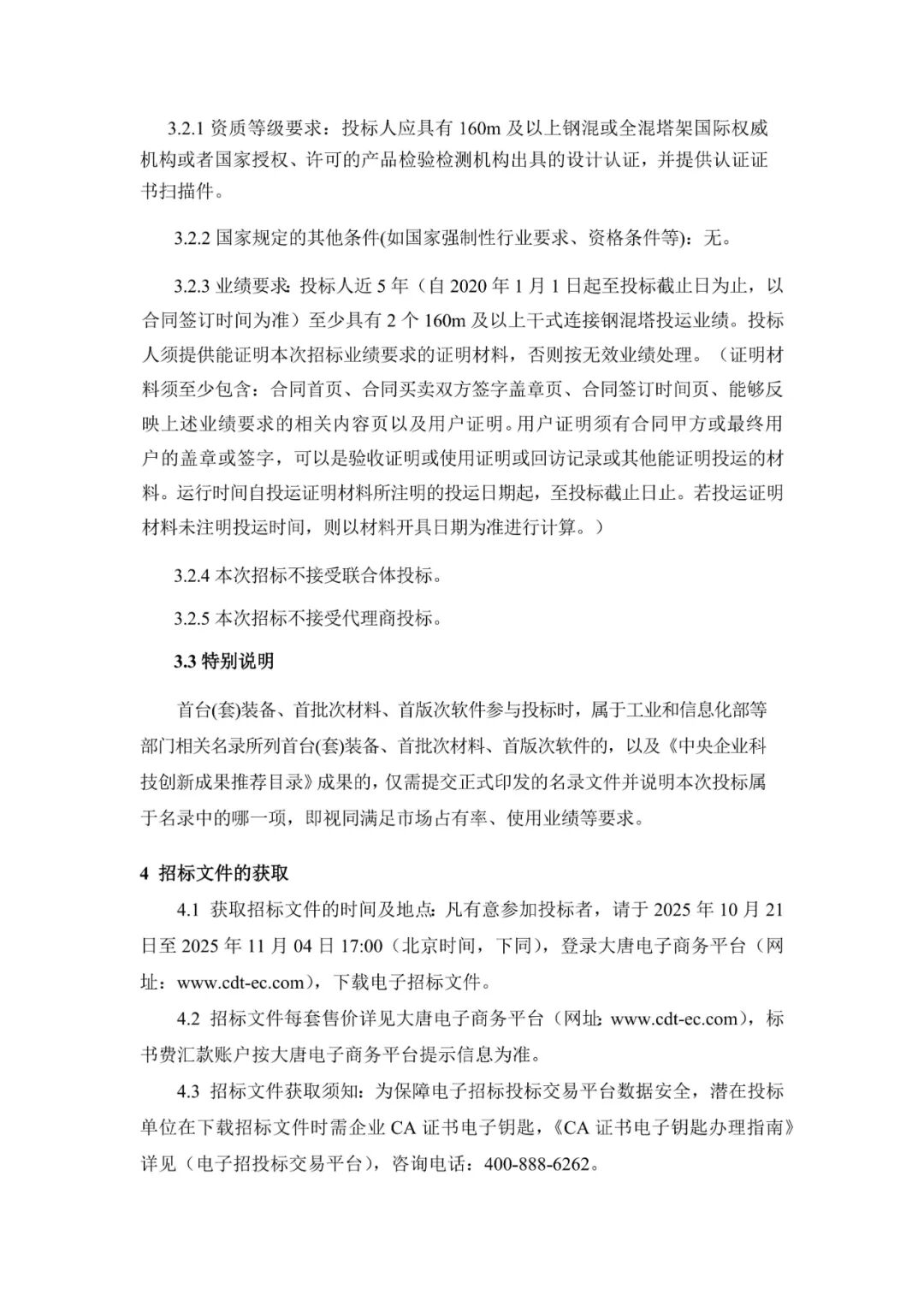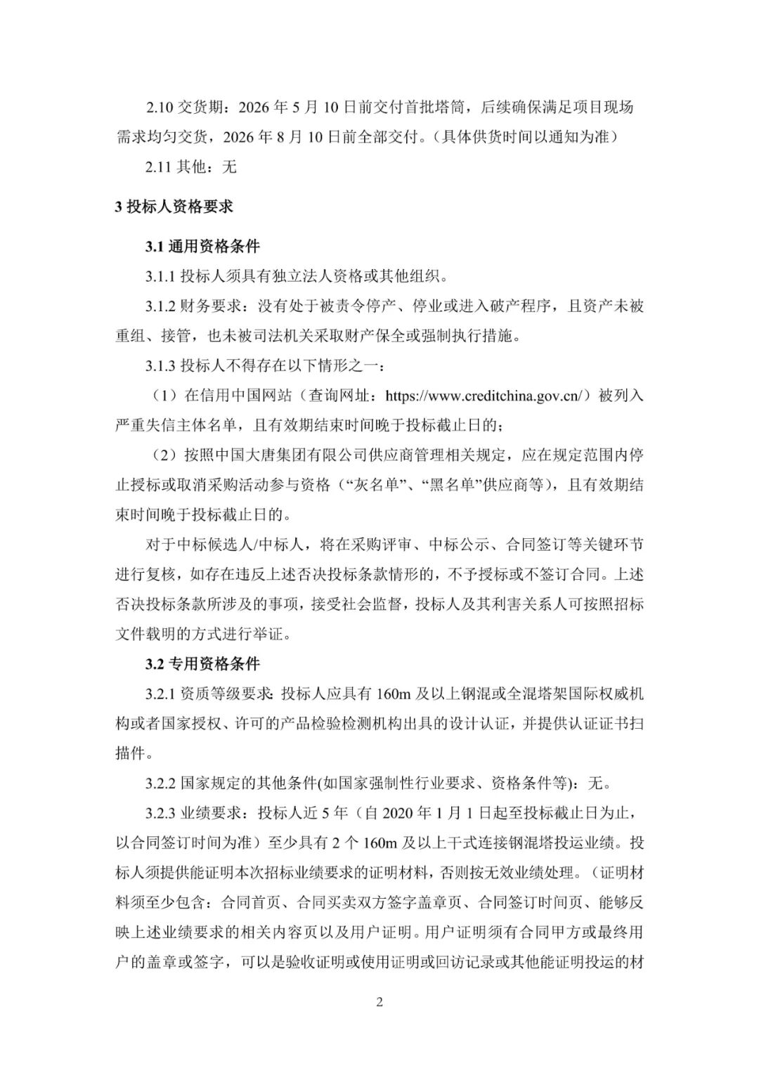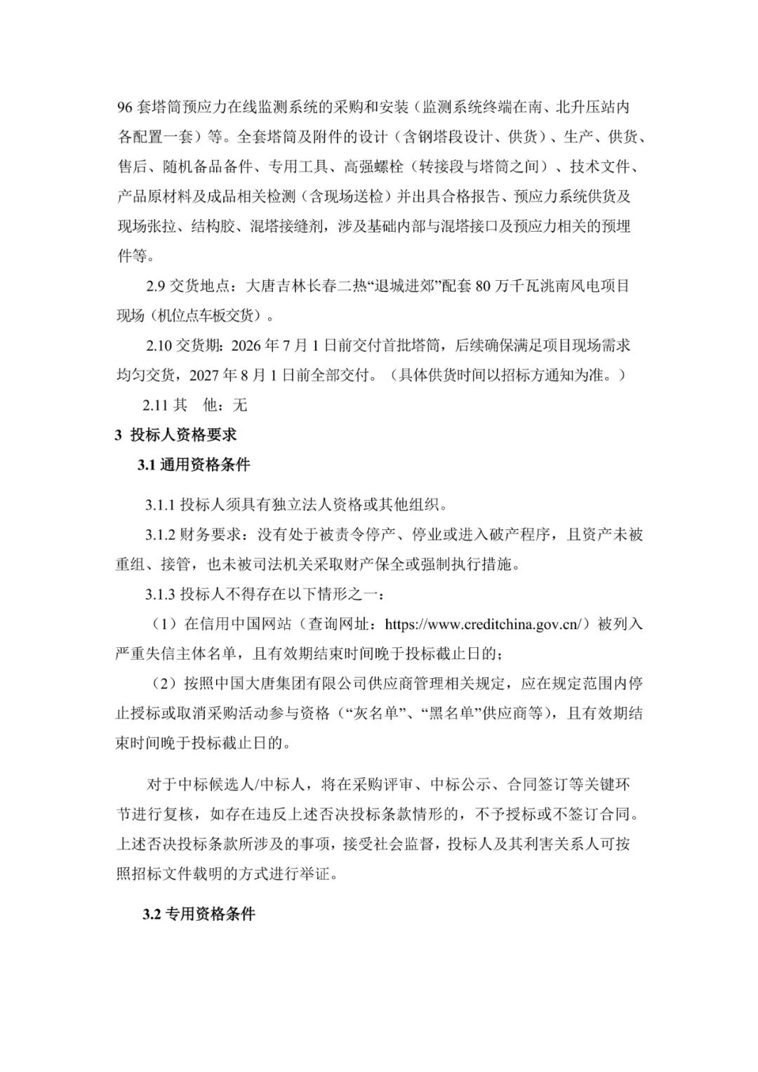 大唐黑龙江宝清200MW风电项目位于黑龙江省双鸭山市宝清县境内夹信子镇、龙头镇,建设规模200MW,安装24台8.35MW风力发电机组,型号SI-230835-HH160,叶轮直径230m,轮毂高度160m,风机塔架为钢混型式。采购范围:24台风力发电机组混凝土塔架段制造及供货(包括基础预埋件、内附件、拼接胶等材料及运输);24台风力发电机组钢塔段设计、制造及供货(包括钢板、法兰、连接螺栓及内附件及运输)。24套风力发电机组混凝土塔架预应力及其监测系统供货、安装。交货期:2026年5月10日前交付首批塔筒,后续确保满足项目现场需求均匀交货,2026年8月10日前全部交付。