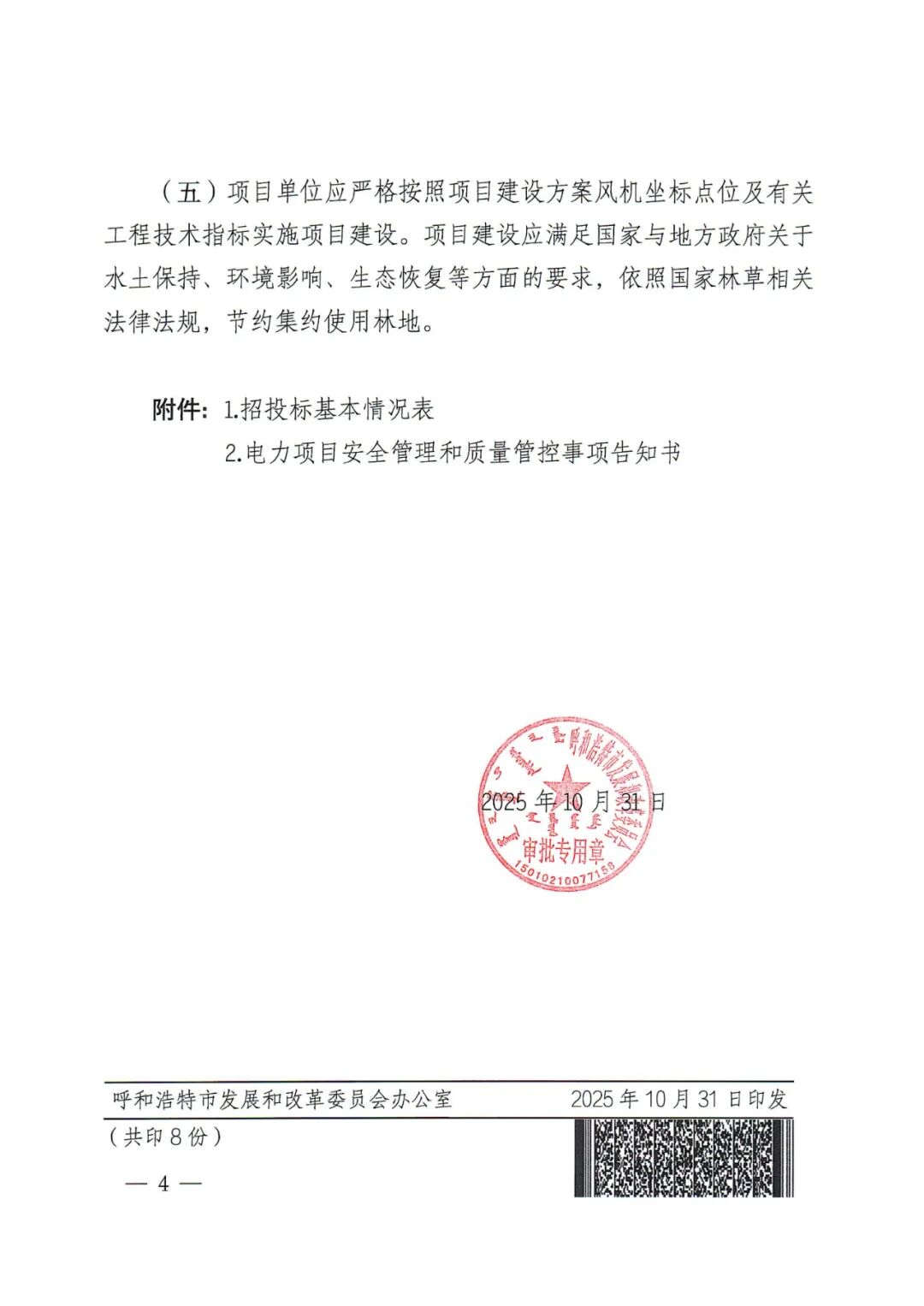 其中,呼和浩特和林格尔新区华电能源有限公司和林格尔20万千瓦工业园区绿色供电项目(风电部分)位于和林格尔县大红城乡、羊群沟乡、新店子镇,项目建设单位为呼和浩特和林格尔新区华电能源有限公司,风电装机容量150MW,拟安装24台单机容量为6.25MW的风力发电机组,储能按25%(4小时)进行配置,规模为50MW/200MWh。项目动态总投资66413.8万元。