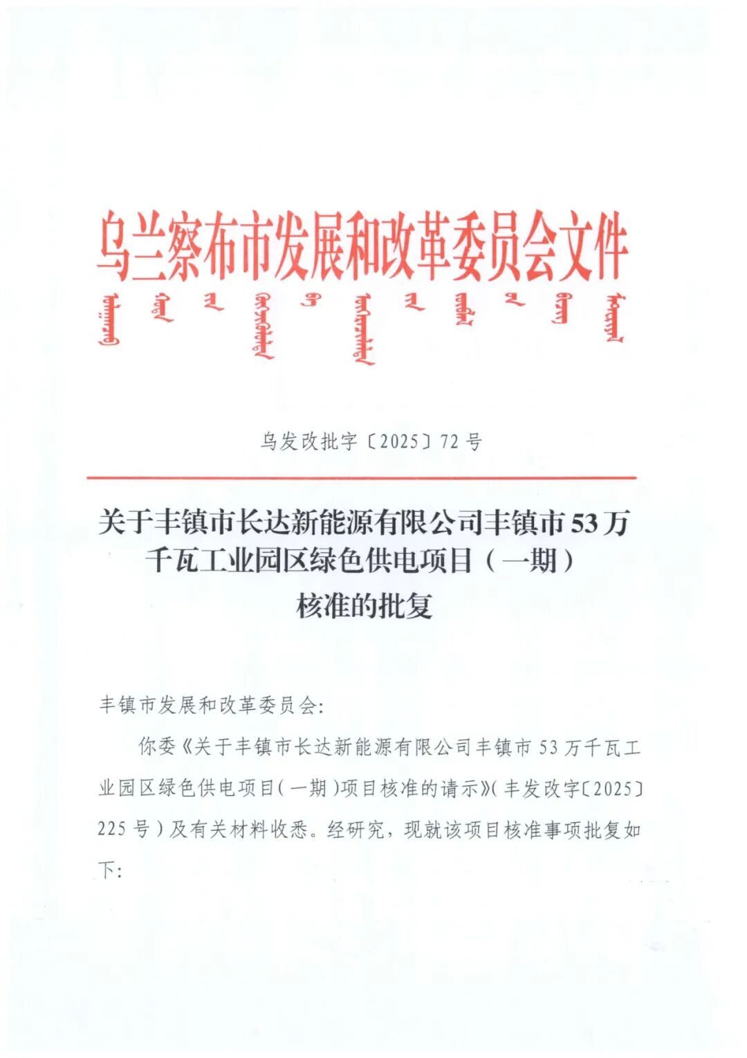 丰镇市长达新能源有限公司丰镇市53万千瓦工业园区绿色供电项目(一期)位于内蒙古自治区乌兰察布市丰镇市,项目单位为丰镇市长达新能源有限公司,项目装机规模26.45万千瓦,其中风电21.45万千瓦,光伏发电5万千瓦,配套建设3.9675万千瓦/4小时储能。项目总投资143498万元。