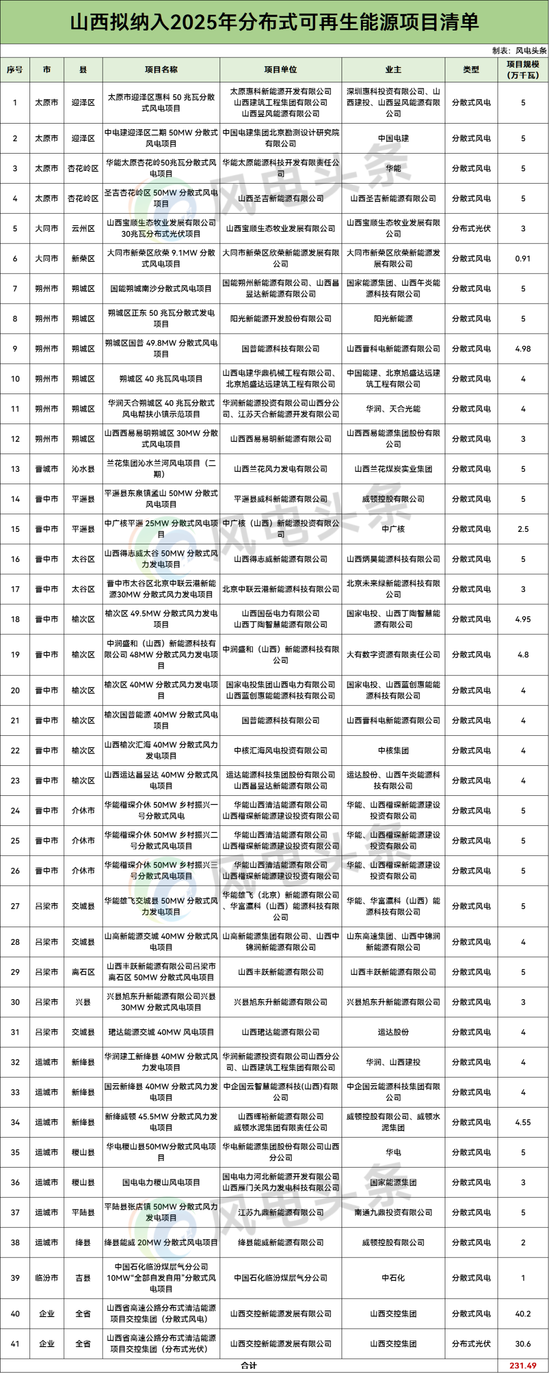 其中,分散式风电项目39个,规模合计197.89万千瓦;分布式光伏项目2个,规模合计33.6万千瓦。