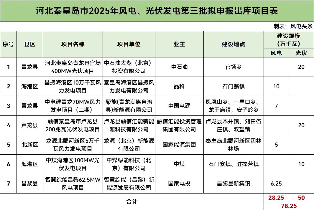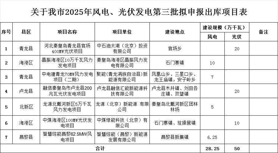 据悉,此前,秦皇岛市发布2025年风电、光伏发电第二批指导计划规模内项目出库公示。