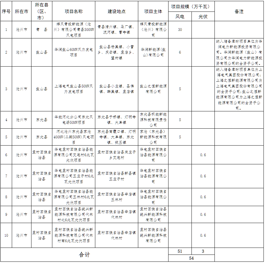 沧州市储备类项目拟申报纳入全省2025年风电、光伏发电年度开发建设方案名单