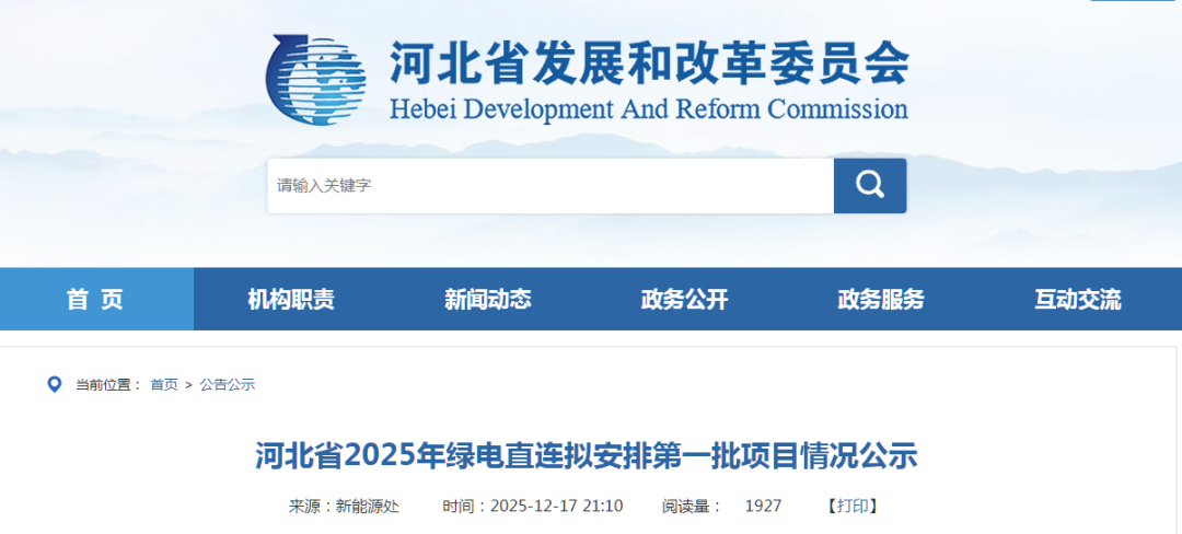 风电头条获悉,12月17日,河北省发展和改革委员会发布《河北省2025年绿电直连拟安排第一批项目情况公示》。