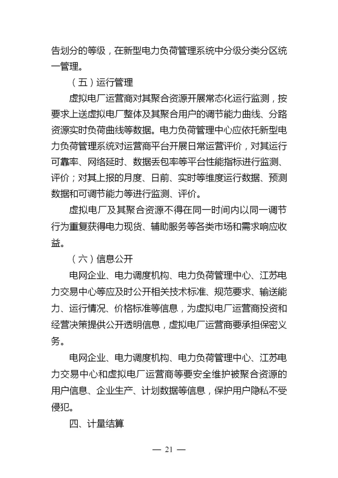 (三)完善三级集成平台系统。省级市场主要依托电力交易平台、电力调度自动化系统和新型电力负荷管理系统,制定建设运营方案(附件2),为虚拟电厂系统接入、市场参与、需求响应等提供支撑和服务。市(县)级虚拟电厂集成平台系统可根据辖区内虚拟电厂的发展进程和管理需要,接入全市(县)虚拟电厂进行动态监测,适时建设可调节资源库,推动虚拟电厂因地制宜发展,提升区域电力调节能力。园区(企业)级虚拟电厂运营商集成平台系统需具备监测、预测、指令分解执行等功能,优化调控聚合资源。