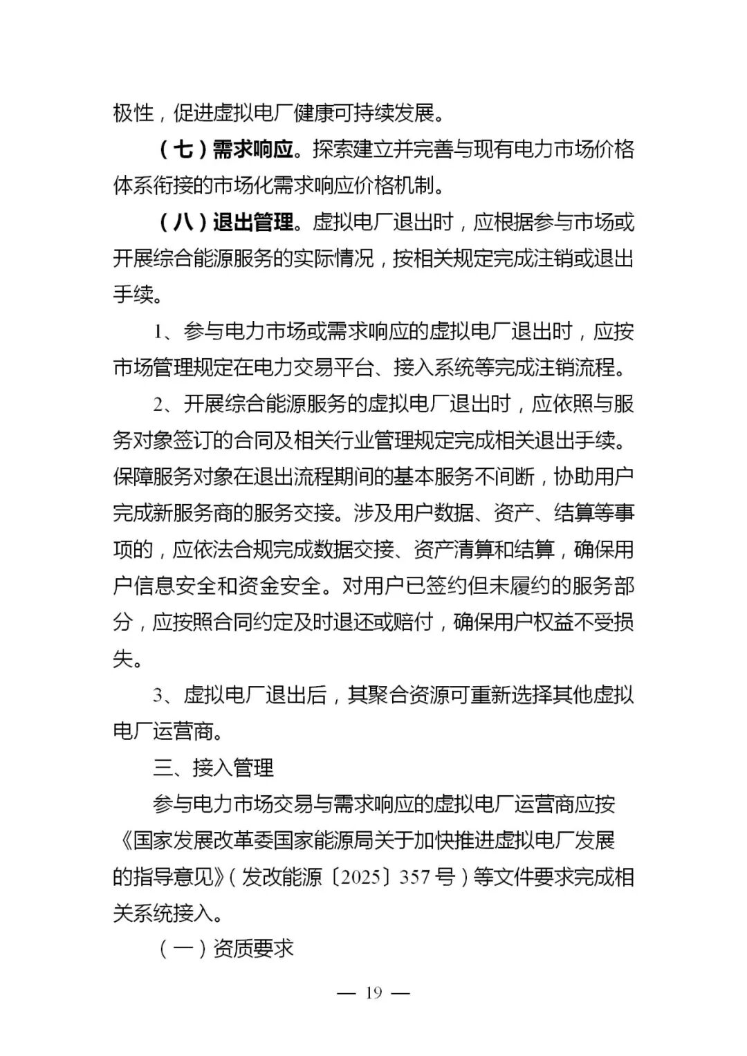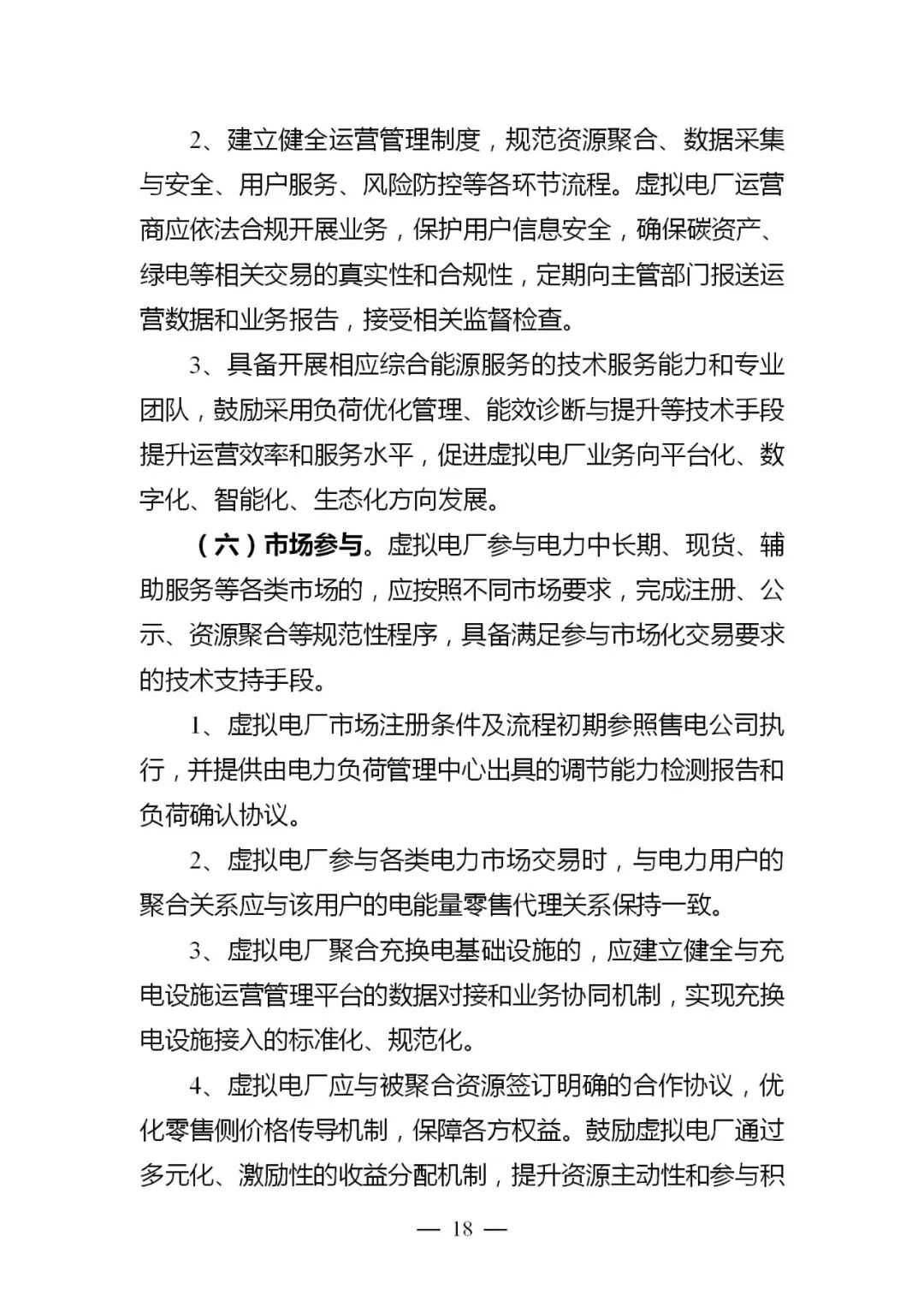 (十一)完善市场机制。按照“一个市场、多种产品”的基本原则,统筹开展电力中长期、现货、辅助服务等市场和需求响应规则设计,进一步强化各类交易间的有机衔接、深度融合。探索推动虚拟电厂等具备灵活调节能力的资源,按电网分区或节点聚合资源参与电力现货市场,适度放开参与现货市场电量比例,引导其充分发挥调节能力。优化零售市场价格传导机制,鼓励虚拟电厂通过合同约定将现货市场的价格信号传导至终端用户,利用价格信号引导聚合的用户响应市场需求。