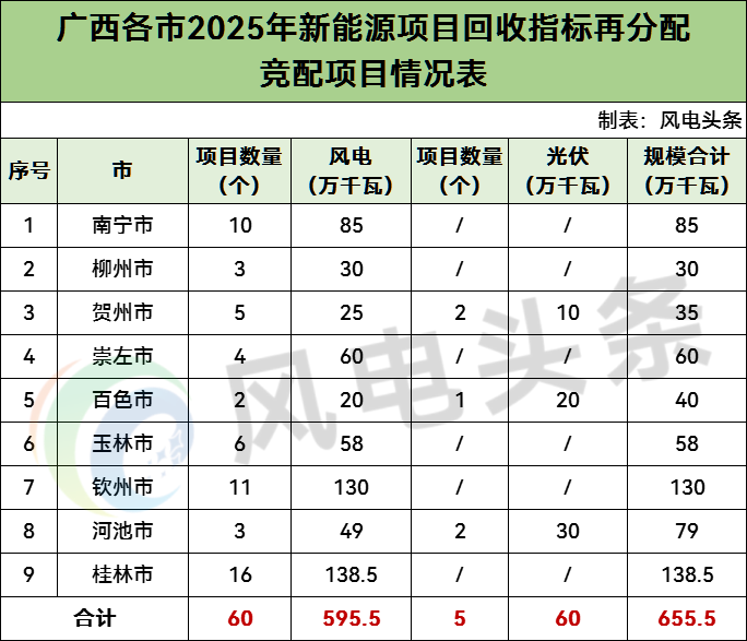 据风电头条统计,截至目前,广西共9市公示了2025年新能源项目回收指标再分配竞争性配置评分结果,规模合计655.5万千瓦。