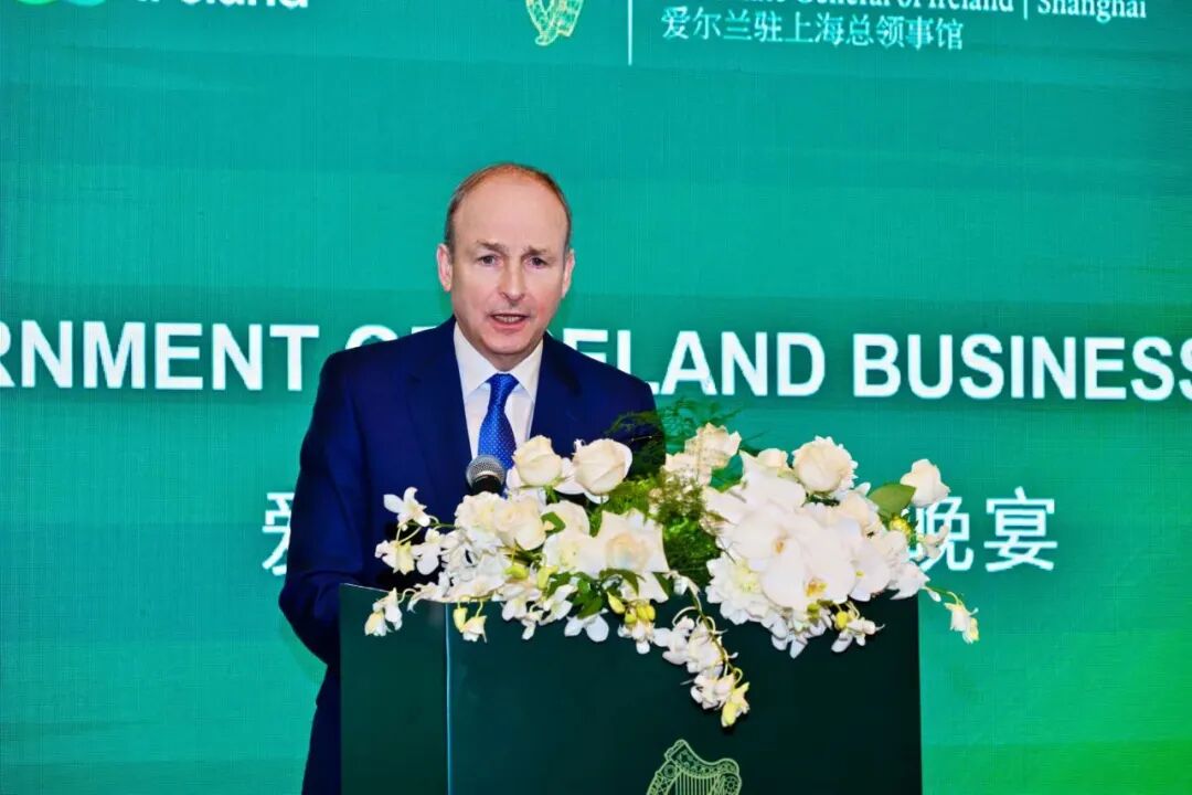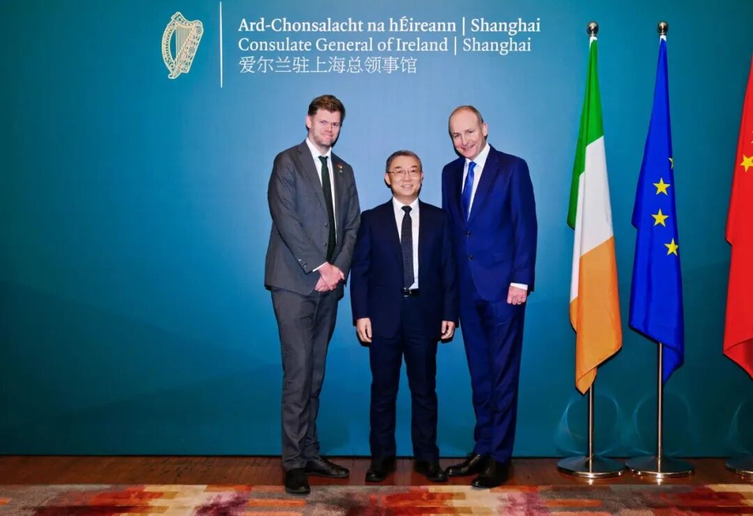 - 左为爱尔兰驻上海总领事馆总领事 David Murphy;中为公司副总裁赵建民;右为爱尔兰总理 Micheál Martin-